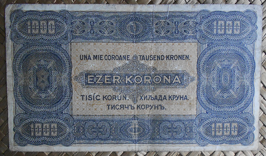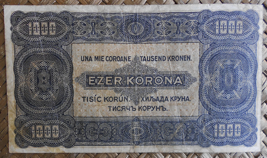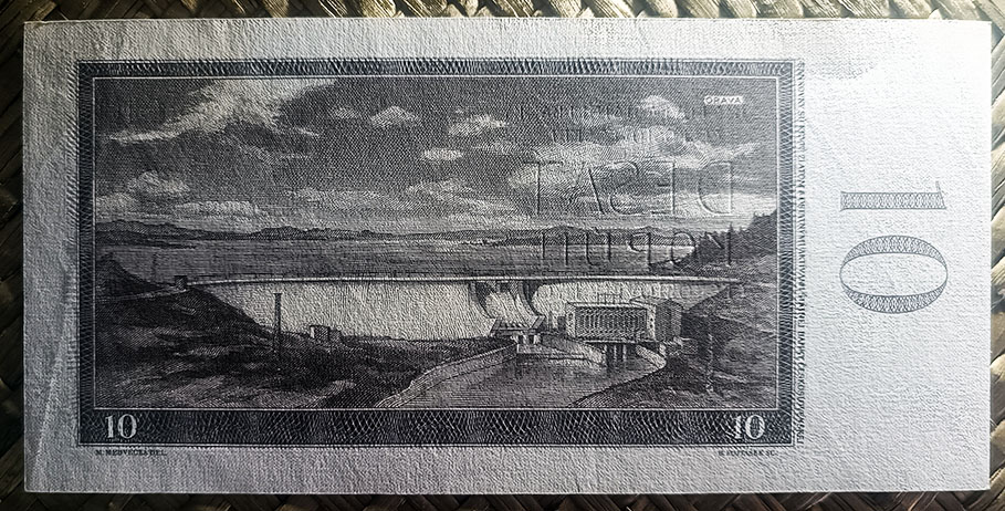 En el reverso nos ofrecen un grabado de las ruinas del Castillo de Devin, en la confluencia de los ríos Danubio y Morava, en la frontera entre las actuales Chequia y Eslovaquia. El castillo fue iniciado en el s. VIII, reconstruido como castillo medieval en el s. XIII, como aposento palaciego en el s. XV y destruido por Napoleón Bonaparte en los inicios del s. XIX. Hoy es un museo. Al pie central una especie de jetón medieval sobre el texto que avisa de la penalización ante falsificación. El resto de viñeta se cubre con bandas onduladas multicolores en distribución radial desde debajo del valor del ejemplar en cifras de gran tamaño.