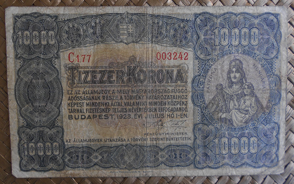 El ejemplar de 10 coronas de Checoslovaquia de 1960, de cromaticidad predominante en tonos marrones ceniza sobre fondo blanco, nos ofrece en su anverso a dos niñas recogiendo flores. De fondo un paisaje montañoso con unas factorías industriales lejanas y sobre la vista aérea un entramado de guilloches alrededor del escudo heráldico nacional. Textos en eslovaco, sin firmas y con número de serie en la columna lateral izquierda tipografiados en rojo. Obra de los artistas grabadores Ladislav Jirka y Bedrich Fojtásek bajo un diseño de María Medvecká.