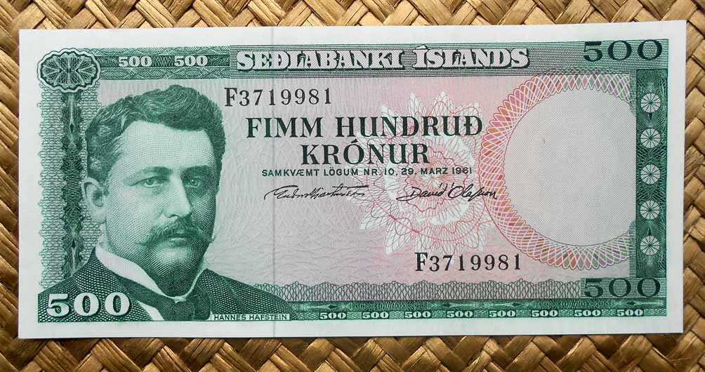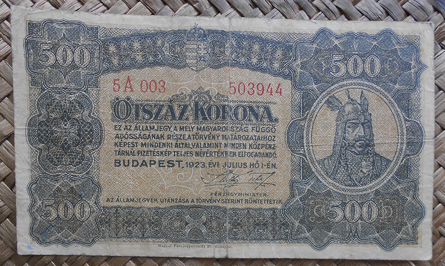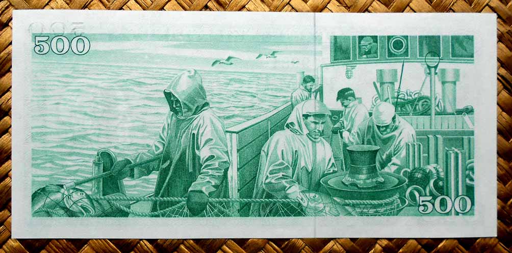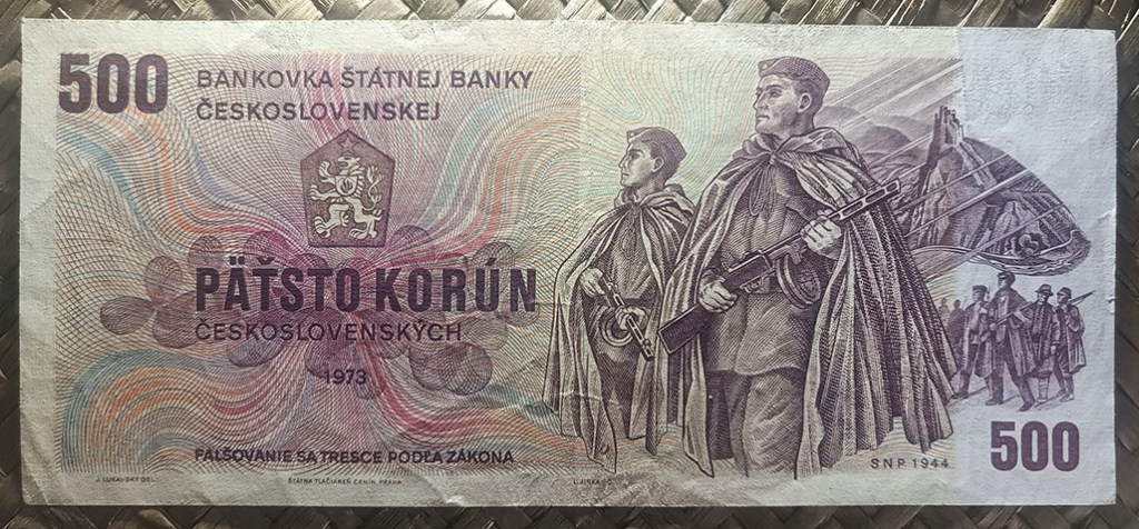 El ejemplar de 500 coronas de Checoslovaquia de 1973, de cromaticidad granate en grabados y rojos, azules y cremas para las composiciones de cicloides, es un diseño de Jaroslav Lukavsky con grabados de Ladislav Jirka y Milos Ondracek. Textos en eslovaco y números de serie al reverso en tipografía roja. Se emitieron las series U, W y Z.