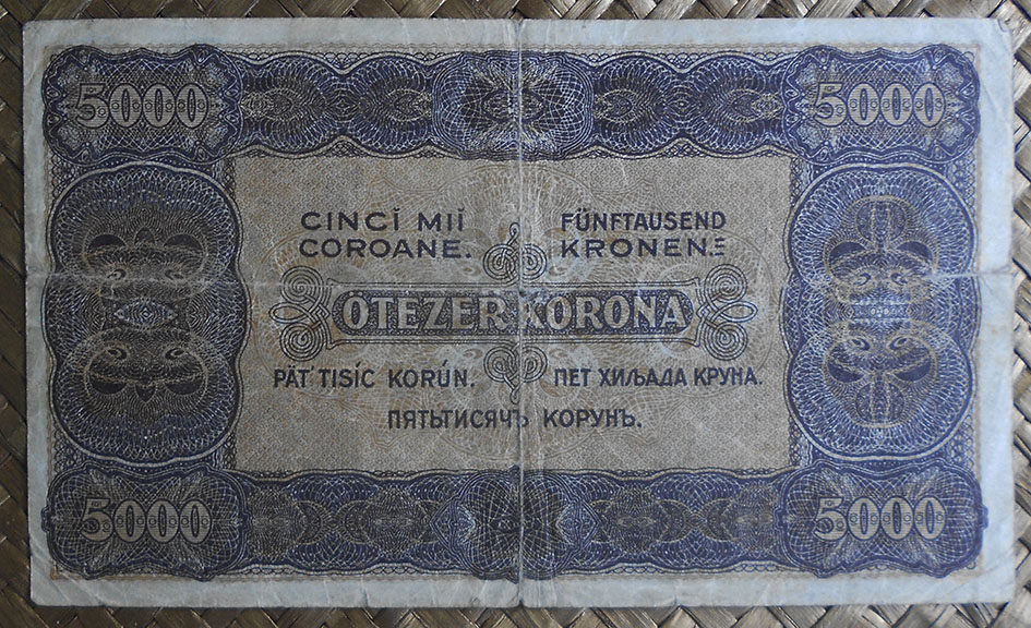 En el lateral derecho del reverso, fuera de la viñeta se dibuja el blasón del escudo checoslovaco con el león rampante coronado por la estrella soviética. En la esquina inferior derecha se muestra el emblema soviético de la hoz y el martillo entre ramas de hojas de tilo. Las otras tres esquinas del marco llevan el valor en cifra del billete. Al pie la cartela con el texto legal de penalización al falsificador.