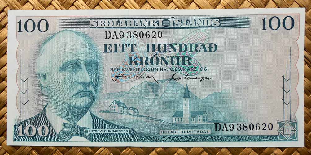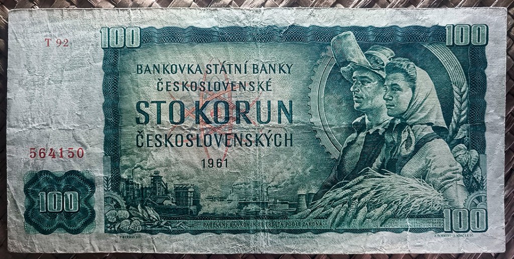 El billete de 100 coronas de Checoslovaquia de 1961, de cromaticidad predominante en verdes, fue diseñado por Frantisek Herman con Jan Mracek y Jindrich Schmitd como artistas grabadores. Textos en checo y números de serie en el lateral izquierdo en tipografía roja.