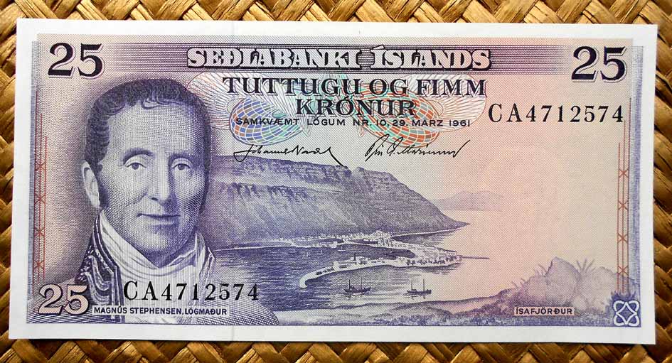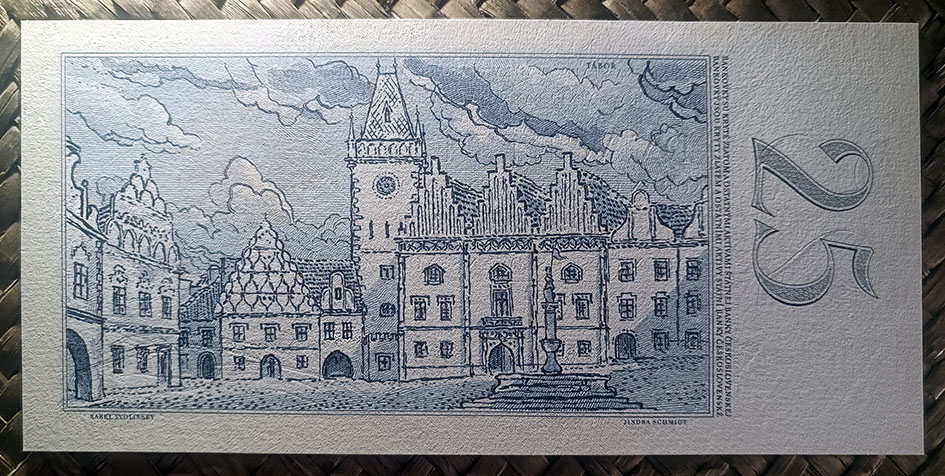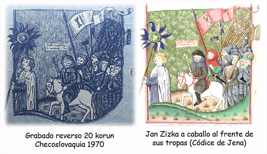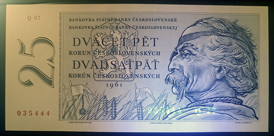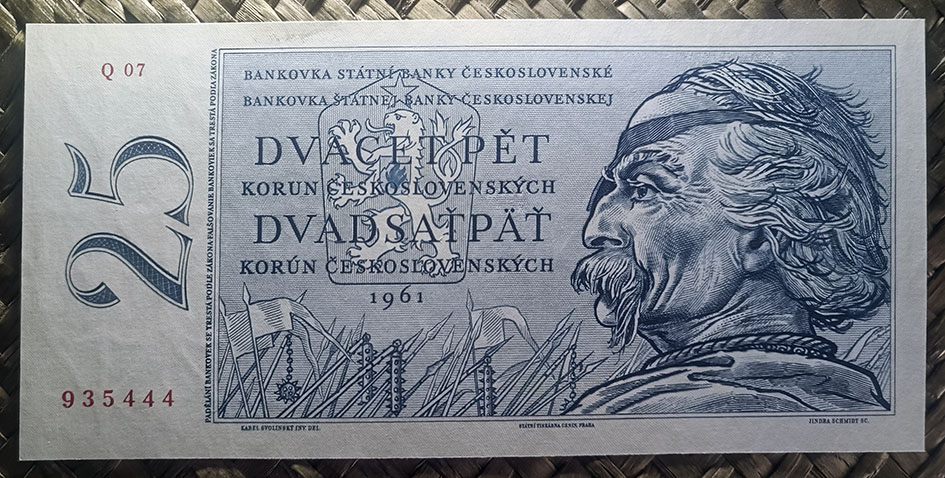 El billete de 25 coronas de Checoslovaquia de 1961, de cromaticidad azul sobre fondo blanco, nos muestra en su anverso la cabeza del militar husita Jan Zizka liderando a sus tropas, que se supone lo acompañan alzando sus lanzas, banderas y armas, a la vista del dibujo que rodea su cabeza y completa el grabado. En la parte central del billete nuevamente se dibuja el escudo heráldico de Checoslovaquia (un león rampante coronado por una estrella soviética de cinco puntas). En la columna izquierda, fuera de la viñeta vemos el número y letra de serie en tipografía roja. Textos en checo y eslovaco. Es un diseño de Karel Svolinský grabado por Jindrich Schmitd.