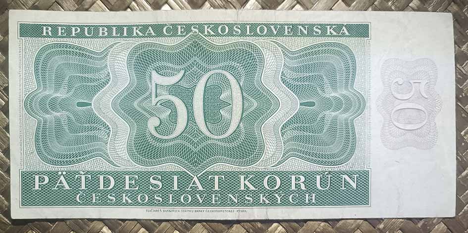 El ejemplar de 50 coronas de Checoslovaquia de 1950 fue expedido por el Ministerio de Finanzas de la República de Checoslovaquia (no por el Státní Banka Ceskoslovenská, que operaría a partir de 1951). Obra de los artistas Ludovík Llecko (diseño) y Ladislav Jirka (grabado). Textos en eslovaco y número de serie en tipografía roja. Lleva la firma de Jaroslav Kabes como Minister Financií (Ministro de Finanzas).