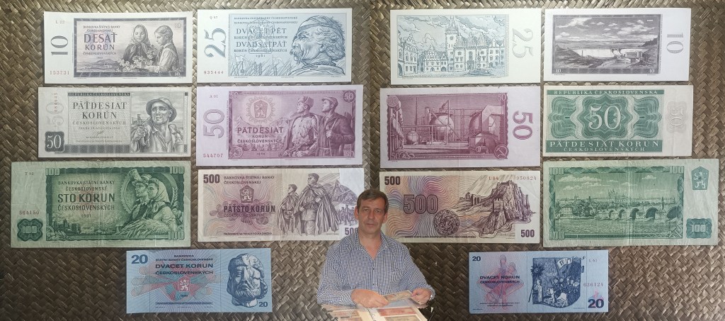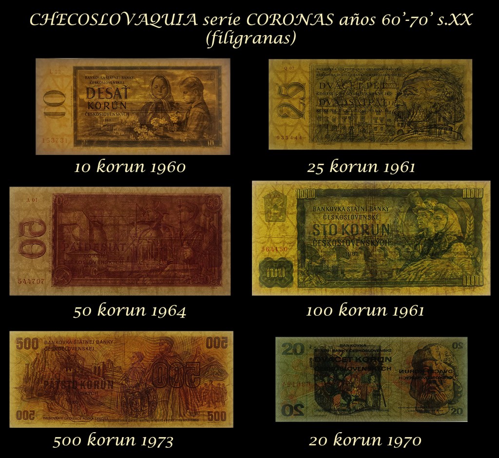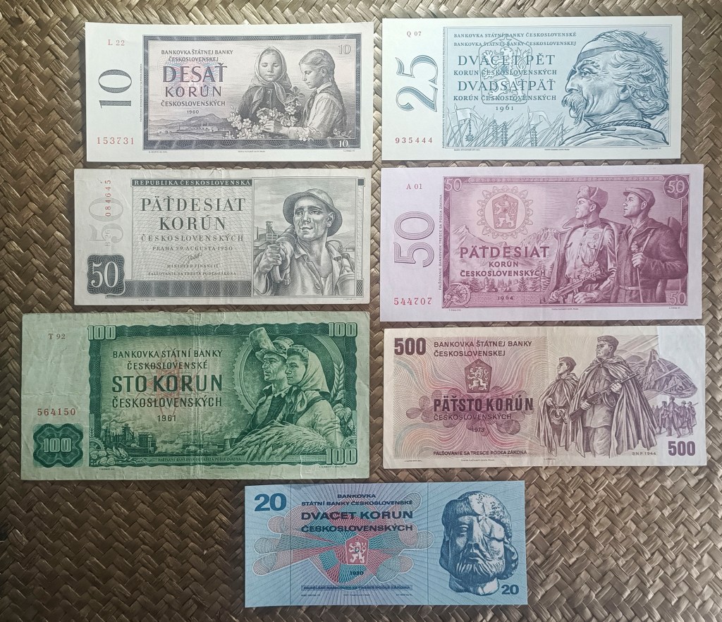 Revisaremos el billetario checoslovaco de los años ’60-‘70 del s.XX. Os mostraré los billetes de 10 coronas de 1960, 20 coronas de 1970, 25 coronas de 1961, 50 coronas de 1950 y 1964, 100 coronas de 1961 y 500 coronas de 1973. Todos emitidos por el Státní Banka Ceskoslovenská (Banco Estatal de Checoslovaquia), excepto el de 50kn de 1950 que fue emitido por el Mntrio de Finanzas de la República.