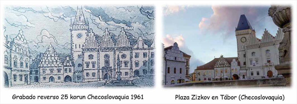 Para el reverso nos ofrecen una panorámica de la plaza Zizkov en Tábor, ciudad fundada por los husitas en época de Jan Zizka, en los inicios del s.XV.