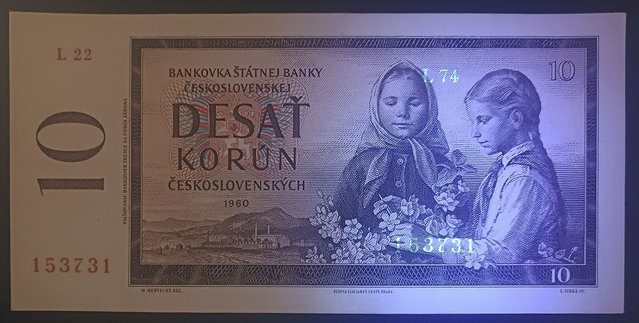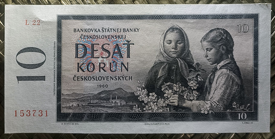 El ejemplar de 10 coronas de Checoslovaquia de 1960, de cromaticidad predominante en tonos marrones ceniza sobre fondo blanco, nos ofrece en su anverso a dos niñas recogiendo flores. De fondo un paisaje montañoso con unas factorías industriales lejanas y sobre la vista aérea un entramado de guilloches alrededor del escudo heráldico nacional. Textos en eslovaco, sin firmas y con número de serie en la columna lateral izquierda tipografiados en rojo. Obra de los artistas grabadores Ladislav Jirka y Bedrich Fojtásek bajo un diseño de María Medvecká.