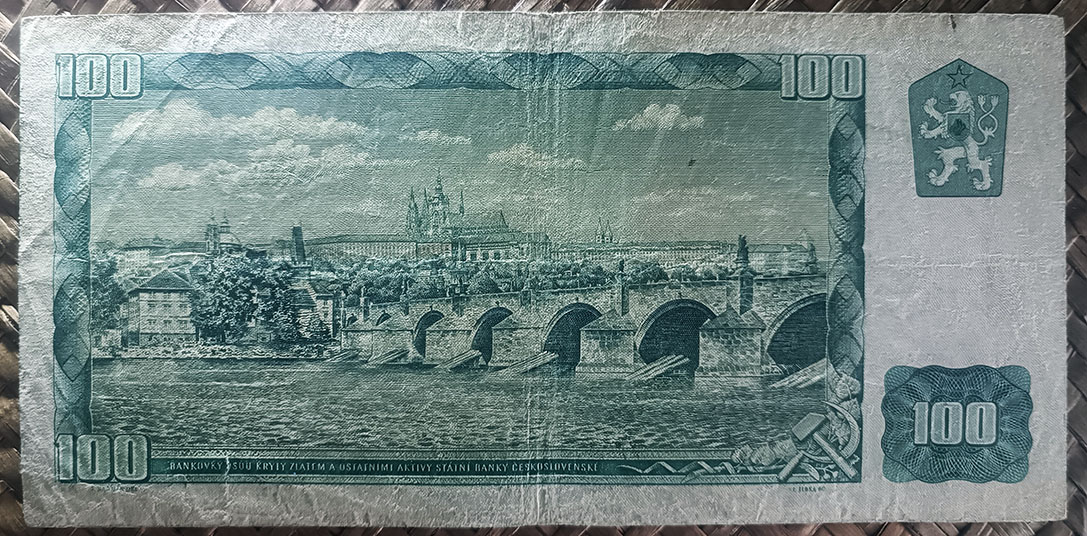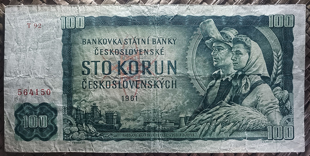 El billete de 100 coronas de Checoslovaquia de 1961, de cromaticidad predominante en verdes, fue diseñado por Frantisek Herman con Jan Mracek y Jindrich Schmitd como artistas grabadores. Textos en checo y números de serie en el lateral izquierdo en tipografía roja.