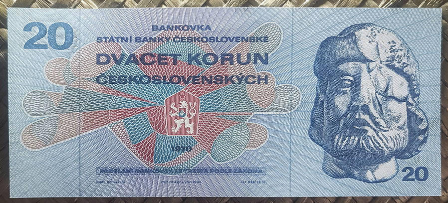 El ejemplar de 20 coronas de Checoslovaquia de 1970 fue impreso en cromaticidad predominante azul para grabados y fondos y en tonos verdes, rojos y violetas en composiciones de guilloches. Textos en checo y número de serie, en color rojo, solo en el reverso. Este billete de 20 coronas rompe completamente con su diseño el típico billete checoslovaco hasta el momento. Su composición cubre completamente la superficie disponible, dejándolo sin márgenes blancos ni marco exterior. Es un diseño de Karel Hruska grabado por Jan Mrácek.