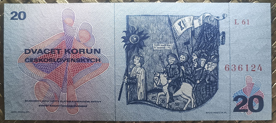 El billete de 25 coronas de Checoslovaquia de 1961, de cromaticidad azul sobre fondo blanco, nos muestra en su anverso la cabeza del militar husita Jan Zizka liderando a sus tropas, que se supone lo acompañan alzando sus lanzas, banderas y armas, a la vista del dibujo que rodea su cabeza y completa el grabado. En la parte central del billete nuevamente se dibuja el escudo heráldico de Checoslovaquia (un león rampante coronado por una estrella soviética de cinco puntas). En la columna izquierda, fuera de la viñeta vemos el número y letra de serie en tipografía roja. Textos en checo y eslovaco. Es un diseño de Karel Svolinský grabado por Jindrich Schmitd.