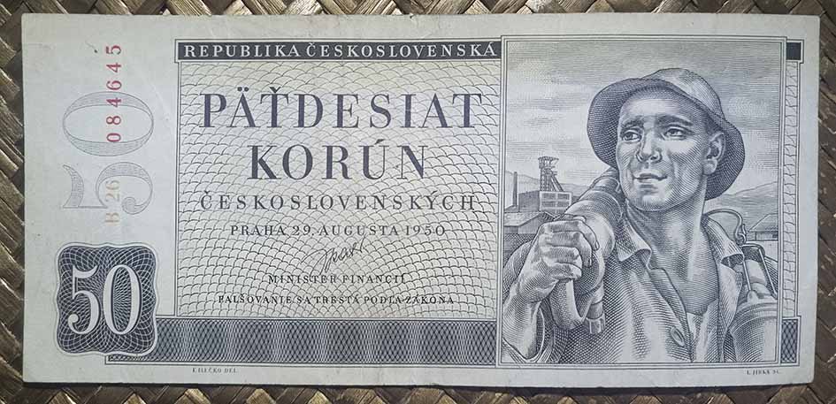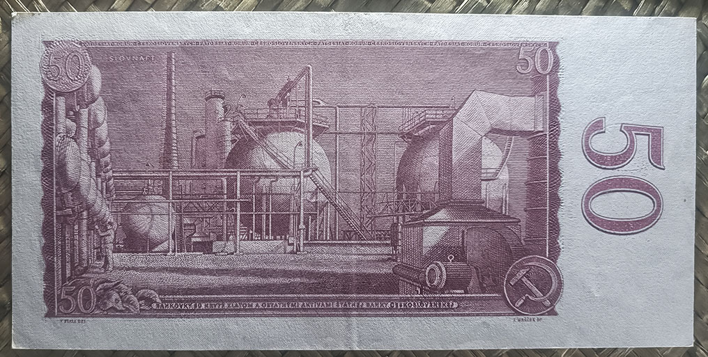 El ejemplar de 50 coronas de Checoslovaquia de 1950 fue expedido por el Ministerio de Finanzas de la República de Checoslovaquia (no por el Státní Banka Ceskoslovenská, que operaría a partir de 1951). Obra de los artistas Ludovík Llecko (diseño) y Ladislav Jirka (grabado). Textos en eslovaco y número de serie en tipografía roja. Lleva la firma de Jaroslav Kabes como Minister Financií (Ministro de Finanzas).