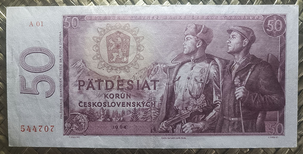 El billete de 50 coronas de Checoslovaquia de 1964, de cromaticidad magenta, fue obra del diseñador Václav Fiala y de los grabadores Ladislav Jirka y Jan Mracek. Textos en eslovaco y números de serie en el lateral izquierdo (fuera de la viñeta) en tipografía roja. Sin firmas.