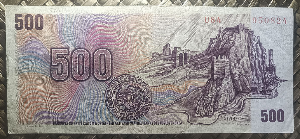 El ejemplar de 500 coronas de Checoslovaquia de 1973, de cromaticidad granate en grabados y rojos, azules y cremas para las composiciones de cicloides, es un diseño de Jaroslav Lukavsky con grabados de Ladislav Jirka y Milos Ondracek. Textos en eslovaco y números de serie al reverso en tipografía roja. Se emitieron las series U, W y Z.