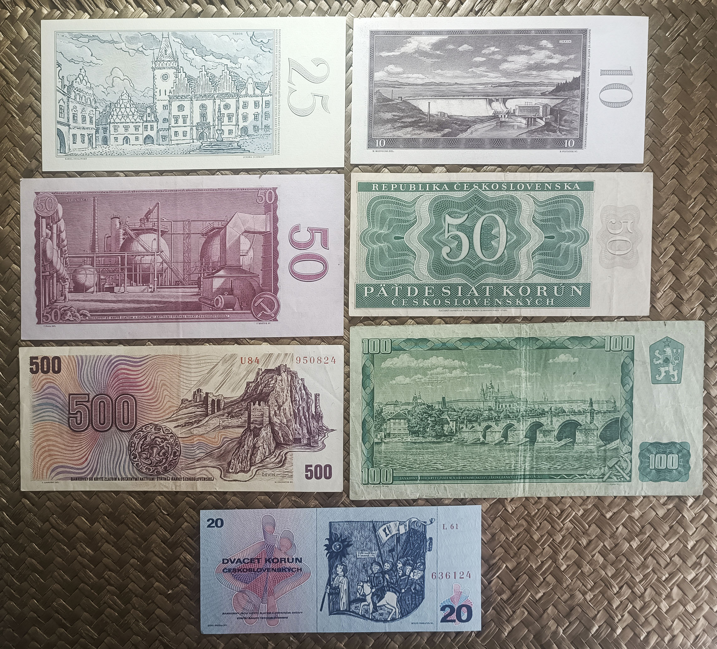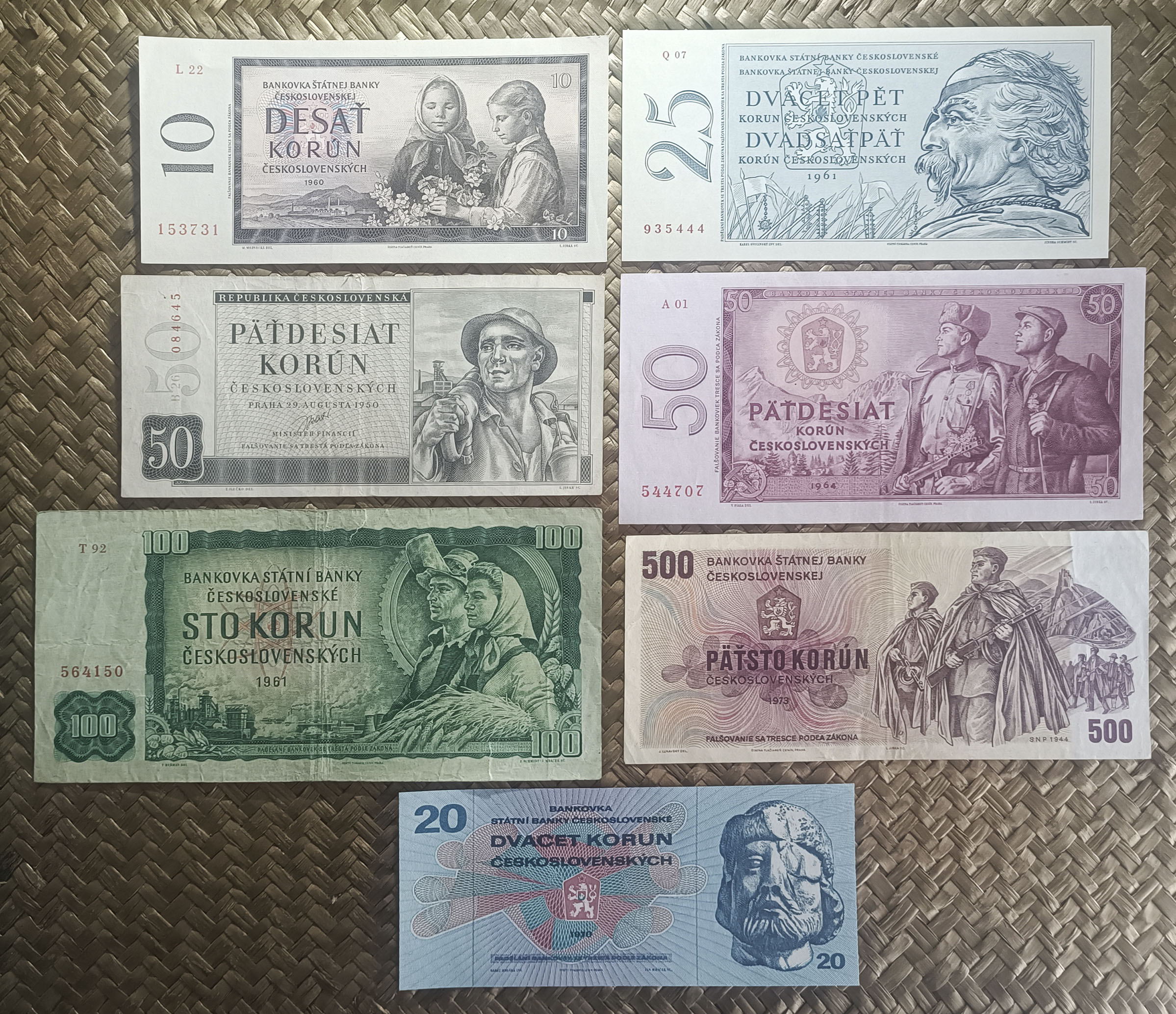 Revisaremos el billetario checoslovaco de los años ’60-‘70 del s.XX. Os mostraré los billetes de 10 coronas de 1960, 20 coronas de 1970, 25 coronas de 1961, 50 coronas de 1950 y 1964, 100 coronas de 1961 y 500 coronas de 1973. Todos emitidos por el Státní Banka Ceskoslovenská (Banco Estatal de Checoslovaquia), excepto el de 50kn de 1950 que fue emitido por el Mntrio de Finanzas de la República.