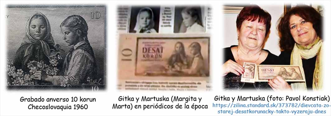 Las dos niñas que sirvieron de modelo fueron retratadas por la pintora Maria Medvecká en su estudio. Eran Gitka Hlaváciková (de 9 años) y Martuska Cisáriková (de 10 años), dos adolescentes anónimas de la región de Orava, que fueron foco de atención décadas después, al ser reconocidas en los billetes, ya solo para coleccionistas. Fuente (ver enlace)