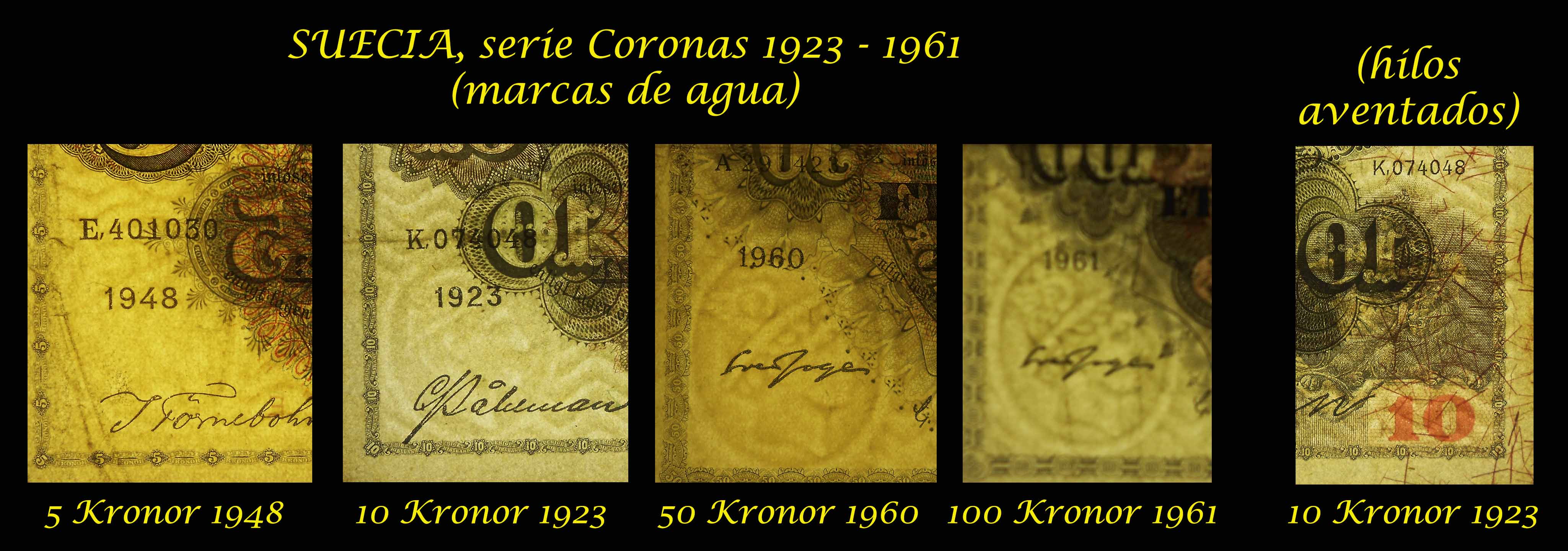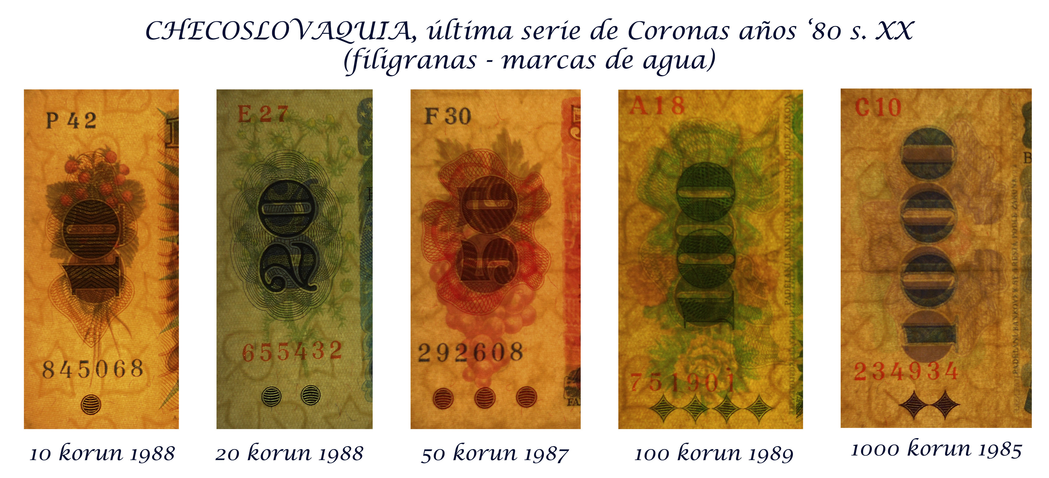 Solo los valores de 500 y 1000 korun llevan marca de agua, para ambos representada por la cabeza ladeada de un joven con una diadema de laurel.