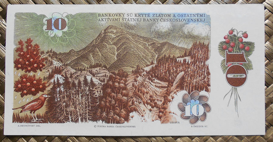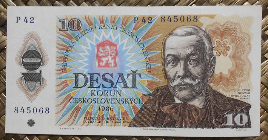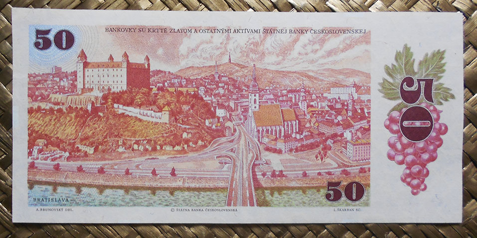 El billete de 50 korun de Checoslovaquia de 1945 ofrece en su anverso al general Milan Rastilav Stefanik (1880-1919), militar eslovaco que participó en la I Guerra Mundial, además de político y diplomático que contribuyó a la creación de la 1ª República Checoslovaca (1918-1938). El reverso muestra un elaborado escudo de armas checo, con una banda y texto “Pravda Vitezi” (la verdad permanece), lema nacional de la República Checa.