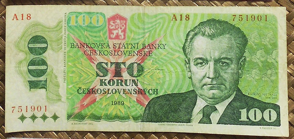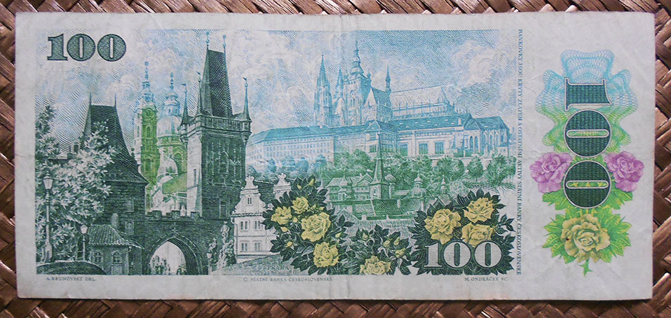 El billete de 100 korun de Checoslovaquia de 1945 lleva en su anverso al Presidente Tomás Masaryk (1850-1937), fundador de Checoslovaquia tras la desmembración del Imperio austrohúngaro y dirigente del país entre 1918 y 1935.