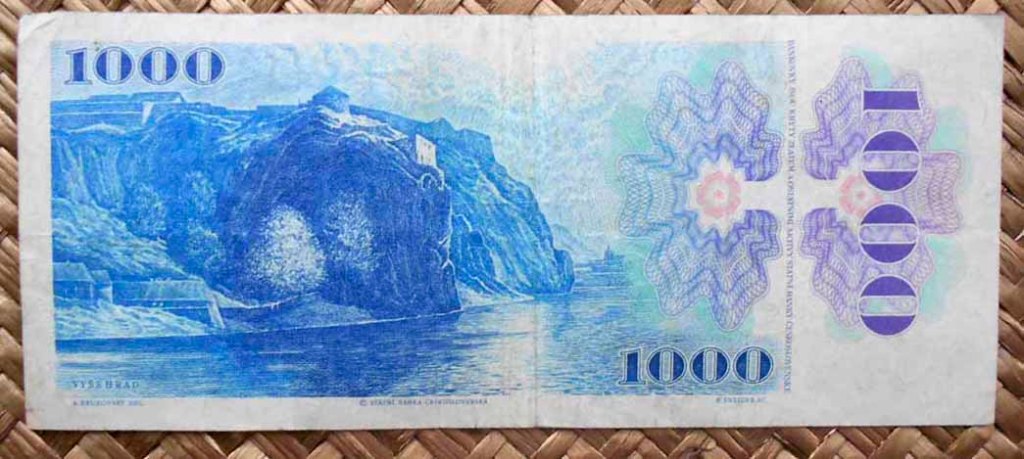 El billete de 1000 korun de Checoslovaquia de 1945 nos muestra en su anverso al rey Jorge de Kunstat y Podebrady (Jiri Z Podebrad; 1420-1471), que ocupó el trono de Bohemia entre 1458 y 1471. Para el reverso nos ofrecen una vista aérea del castillo de Karlstejn (de 1348), cercano a Praga y construido en estilo gótico por orden del rey Carlos IV del Sacro Imperio Romano Germánico.