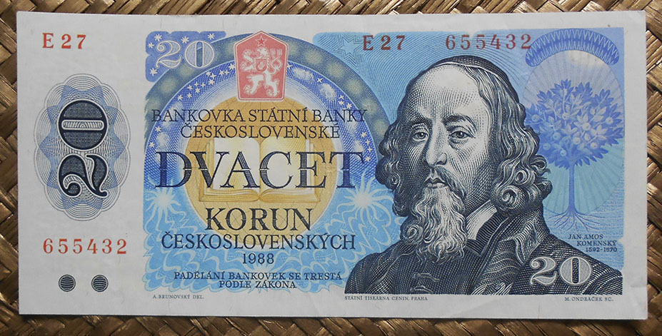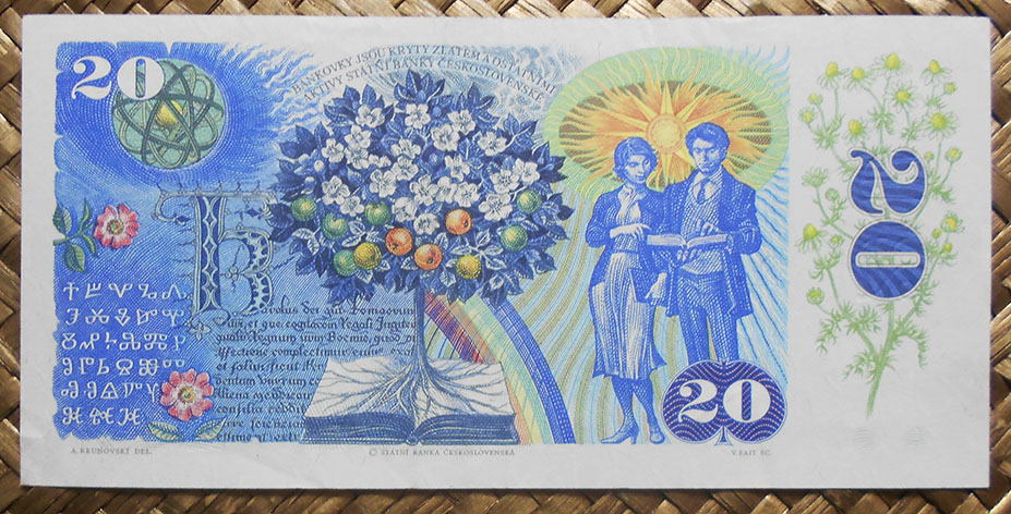 El billete de 20 korun de Checoslovaquia de 1949 rompe los cánones de todos los anteriores, nos ofrece grabados del artista checo Karel Svolinsky (1896-1986), diseñador gráfico de dibujos enraizados en las tradiciones, el folklore y la naturaleza. En el anverso la cabeza y torso de una joven con traje folklórico y en el reverso una campesina y un pájaro pintado sobre un jarrón con un colorista ramo de flores.