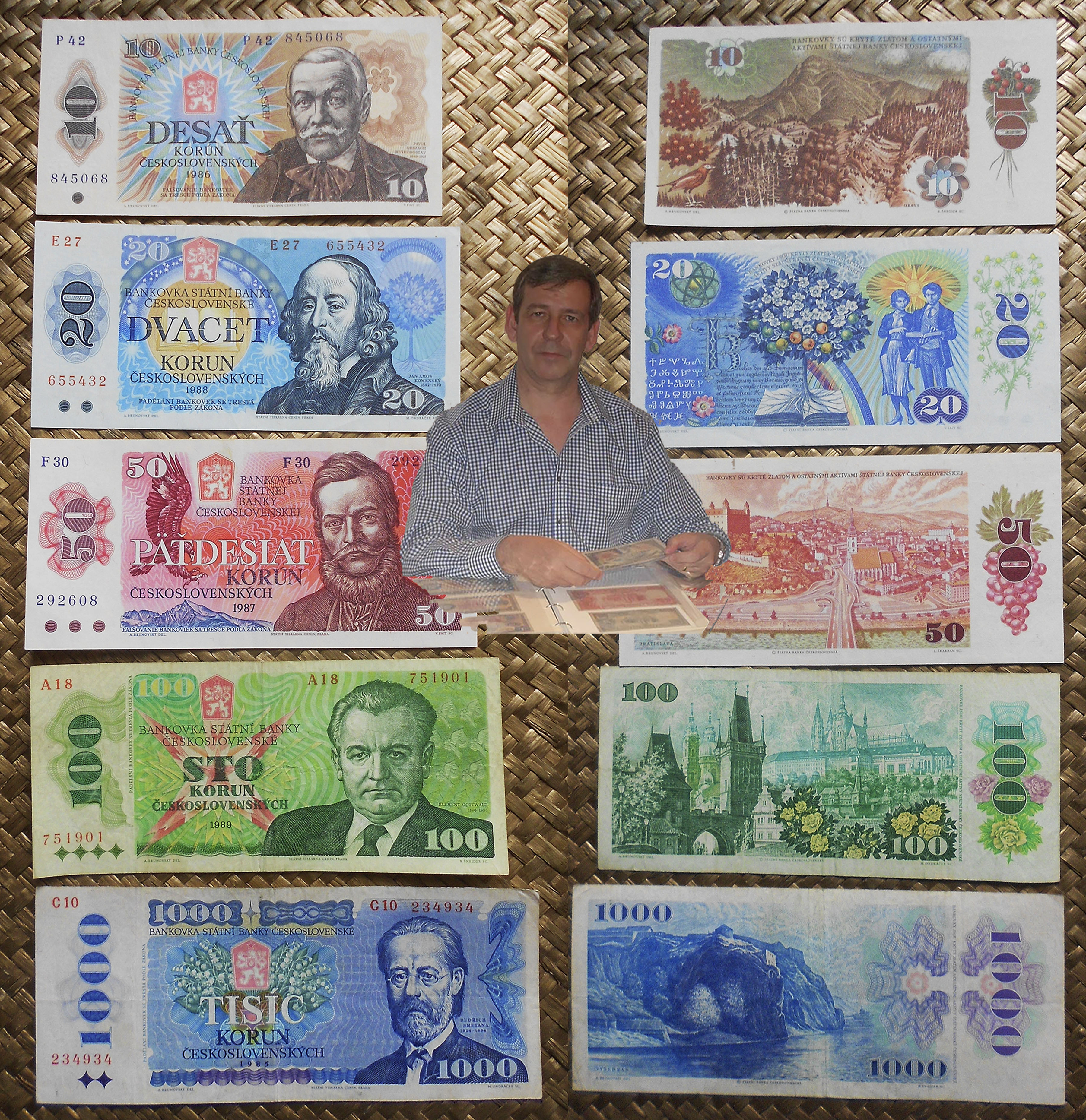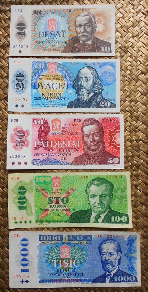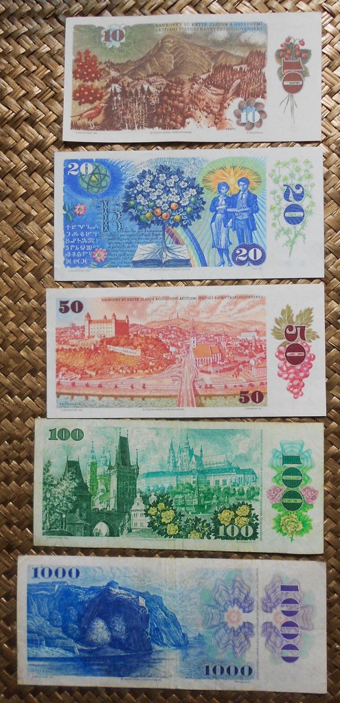 Esta revisión se centrará en el billetario checoslovaco de los años ’40 del s.XX, tras la finalización de la 2ª Guerra Mundial. Os mostraré los billetes en coronas («korun«) de la Tercera República: de 20 korun de 1945, de 50 korun de 1945, de 100 korun de 1945, de 500 korun de 1946, de 1000 korun de 1945 y de 20 korun de 1949. En ellos podremos contemplar el particular escudo checoslovaco con el león rampante, símbolo heráldico del país.