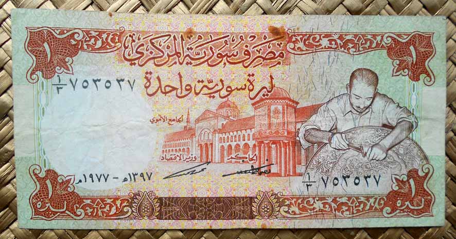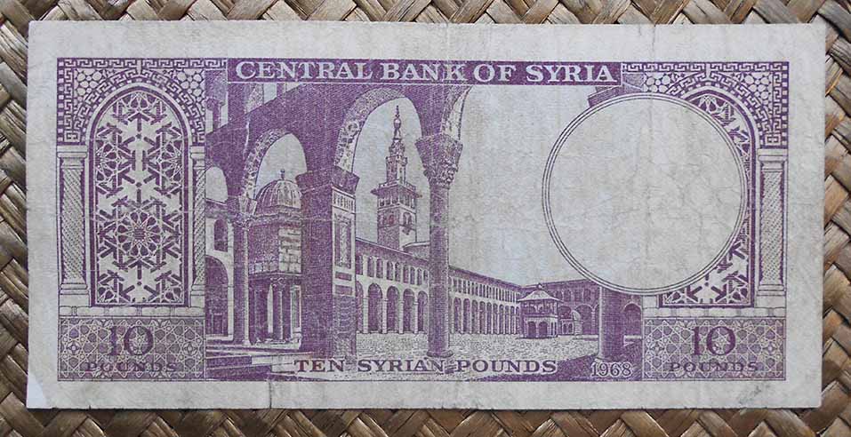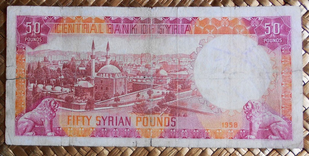 Para el reverso nos guarda una vista aérea de Damasco y en primer plano la Mezquita Tekkiye o del sultan Selim II (hijo de Souleimán el Magnífico, regiría el Imperio Otomano entre 1566 y 1574). A su pie dos leones pétreos enfrentados lateralmente “hacen guardia” al grabado.