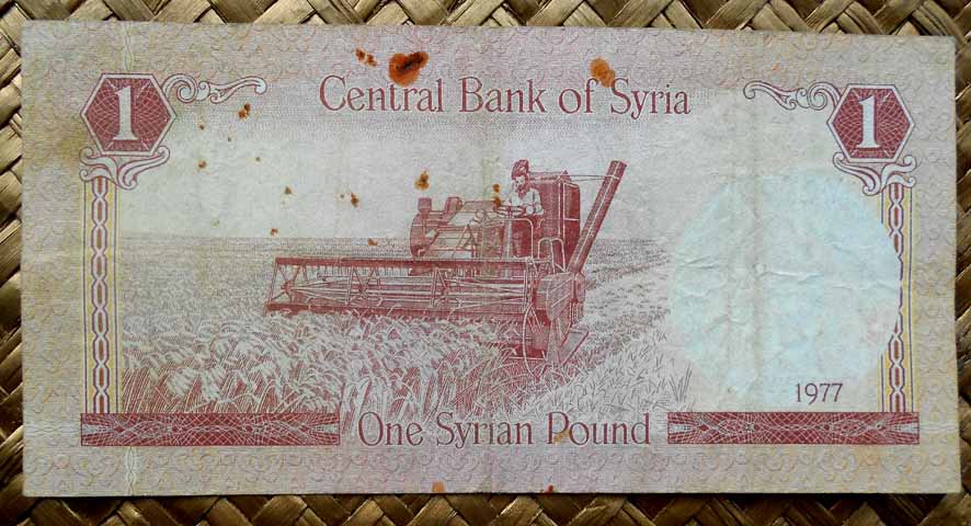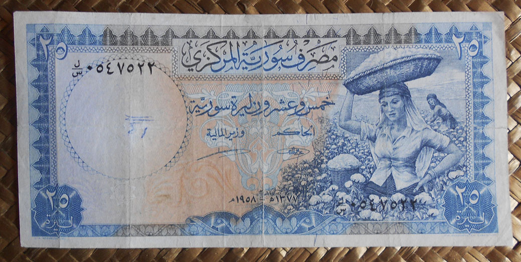 El billete de 25 libras de Siria de 1958 nos muestra a las recolectoras de algodón en un anverso enmarcado entre columnas clásicas. Cromaticidad azulada grisácea con tonos anaranjados.