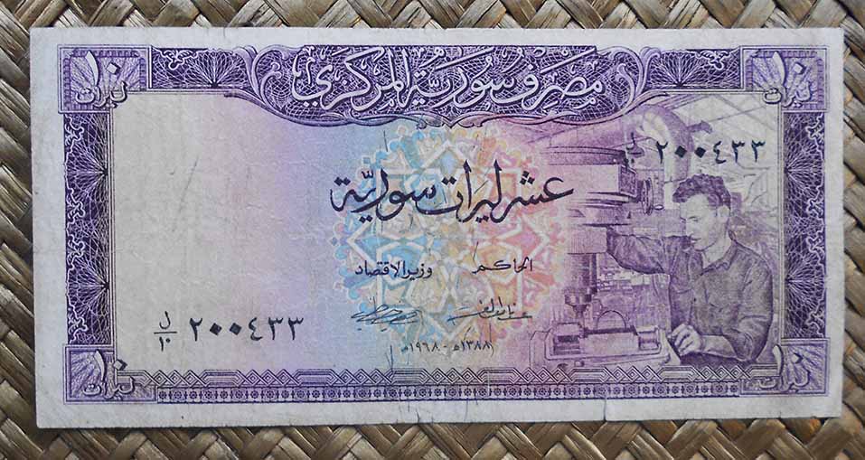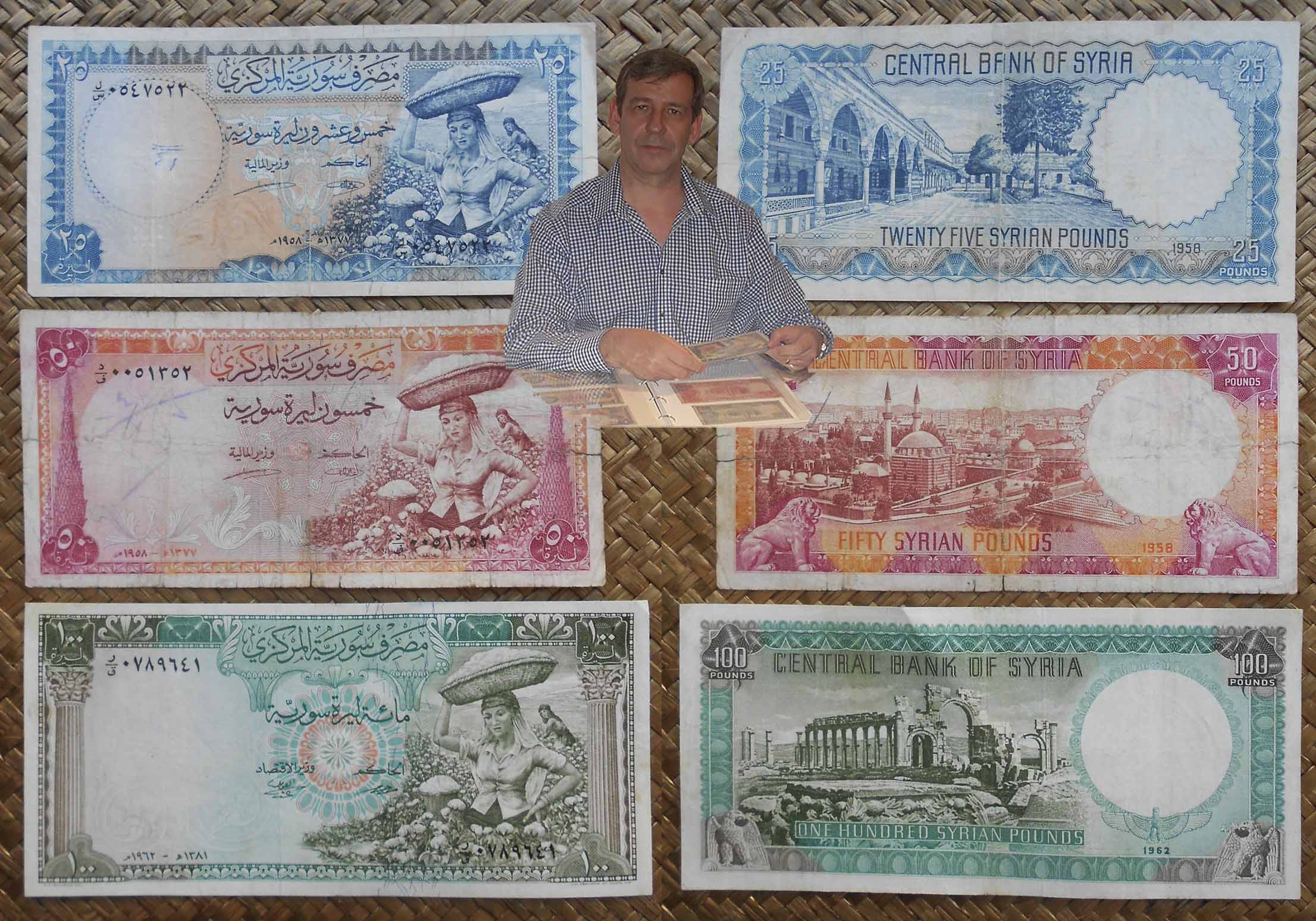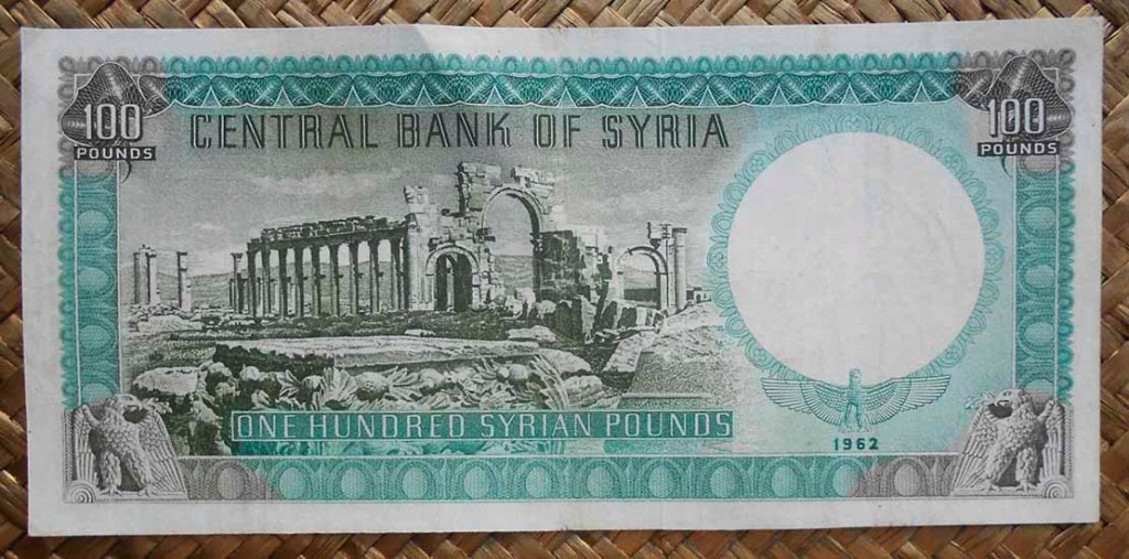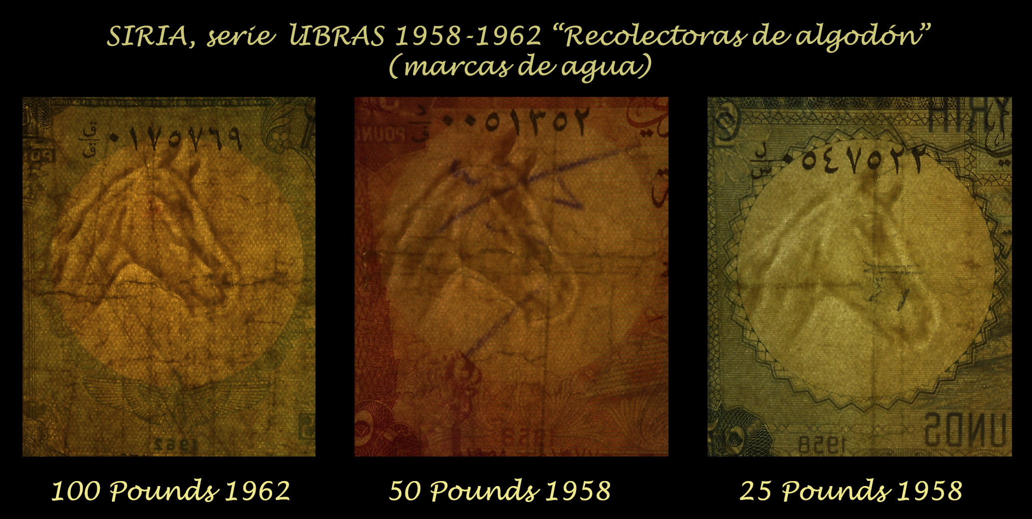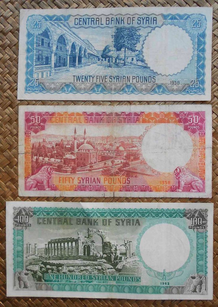 La comparativa notafílica que contemplamos revisará tres ejemplares de los años 1958 a 1962. Una época en la que Siria se instituía como República Árabe Unida junto a Egipto. Son los billetes de 25 y 50 libras de 1958 y el billete de 100 libras de 1962 emitidos por el Central Bank of Syria. Fueron impresos por Johan Enschede en Zonen de Haarlen (Holanda).