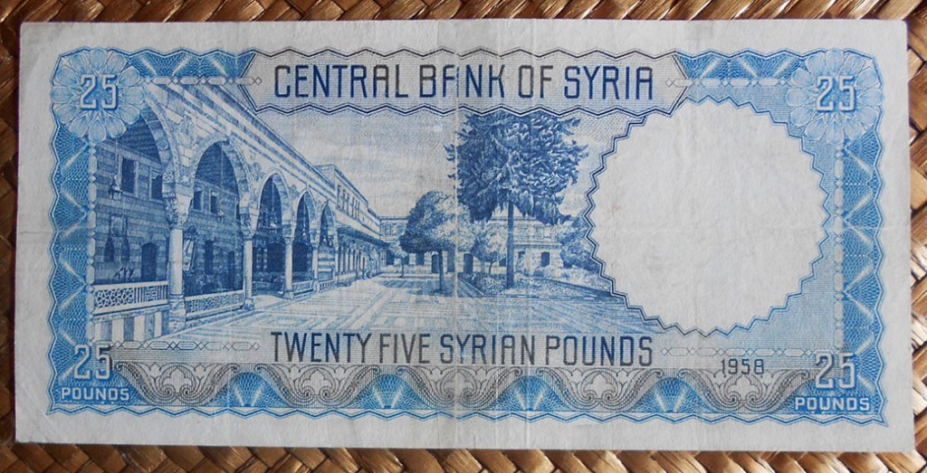 Su reverso nos presenta el patio interior del Palacio de Azem en Damasco (residencia del gobernador As’ad Pasha al-Azm construido en 1750 y actualmente Museo de Artes y Tradiciones).