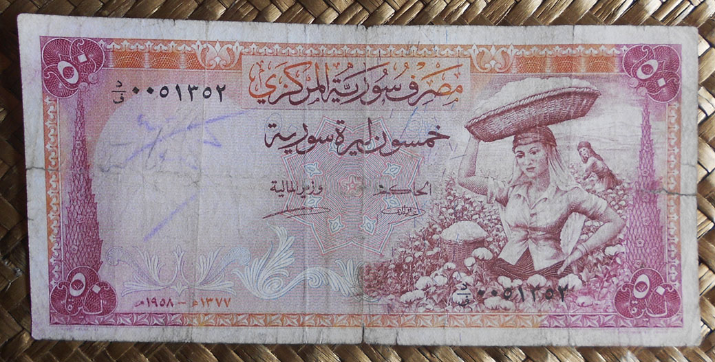El billete de 50 libras de Siria de 1958 nos deleita en su anverso con la recolectora de algodón en una cromaticidad rosácea, púrpura y anaranjada.