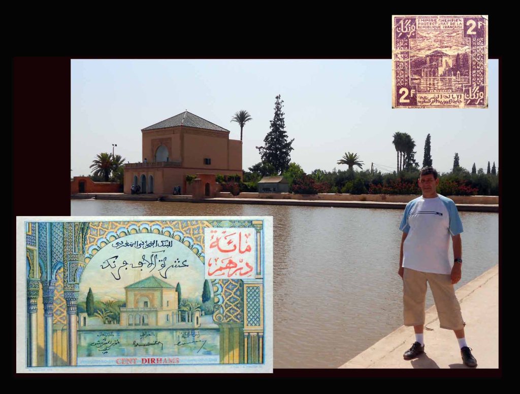 Esta vez dejan para el reverso el resellado con la nueva moneda. En este lado nos muestran un grabado de La Menara y su alberca, en Marrakech. Sobre su recuadro blanco para la marca de agua estampan en caracteres árabes y en rojo la nueva validación en dírhams, resellandola en texto francés rojo al pie del billete.