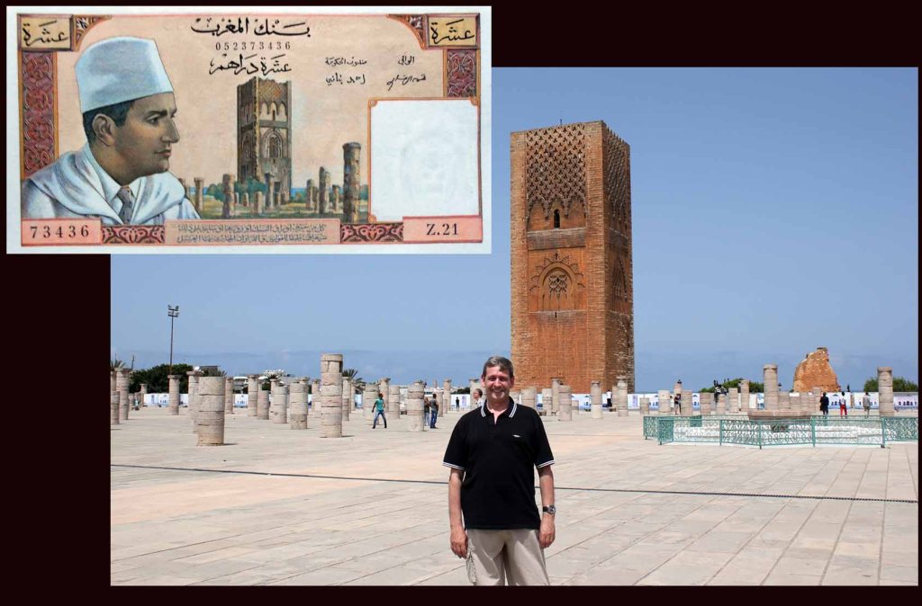 El billete de 10 dirhams de Marruecos de 1963 nos ofrece nuevamente a Mohamed V con el mismo atuendo que en el de 5 dh, pero al lado contrario del campo del anverso. Textos en grafía árabe. El marco esta vez abarca un grabado de la torre Hassam y su columnario alrededor. La torre Hassam es un minarete inacabado de lo que iba a ser la mezquita de Hassam, erigida en 1196 en la ciudad de Rabat, actual capital de Marruecos.