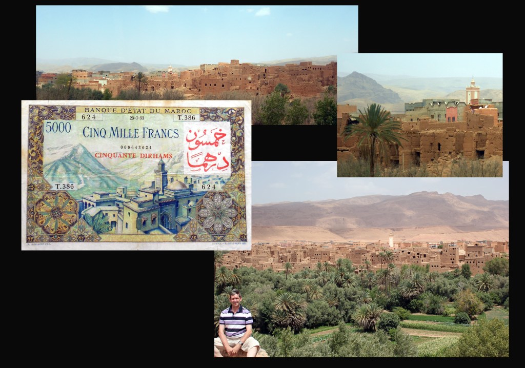 El billete de 5.000 francos resellado 50 dirhams de Marruecos de 1953 (resello 1959) nos ofrece en su anverso la vista de un ksar bajo las montañas, que bien podría ser el pueblo de Tinerhir (¿?) entre el Atlas y la Garganta del Todra, con su minarete presidiendo la kasbah. El resello en tinta roja se coloca sobre la marca de agua en caracteres árabes y bajo el nº de serie al centro en texto francés. Obra de los artistas franceses Marliat, Rafine, Maillart, Munier y Beltrand.