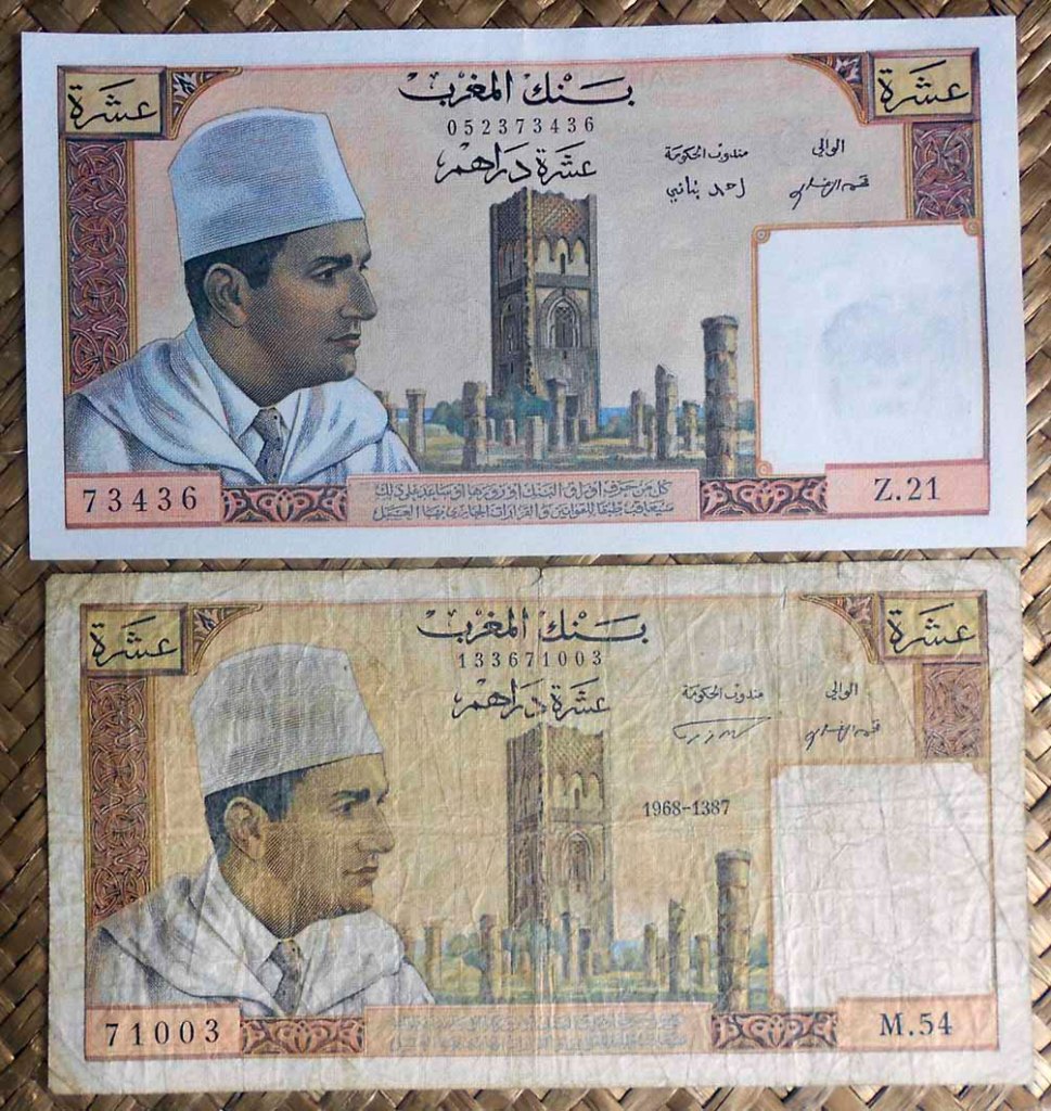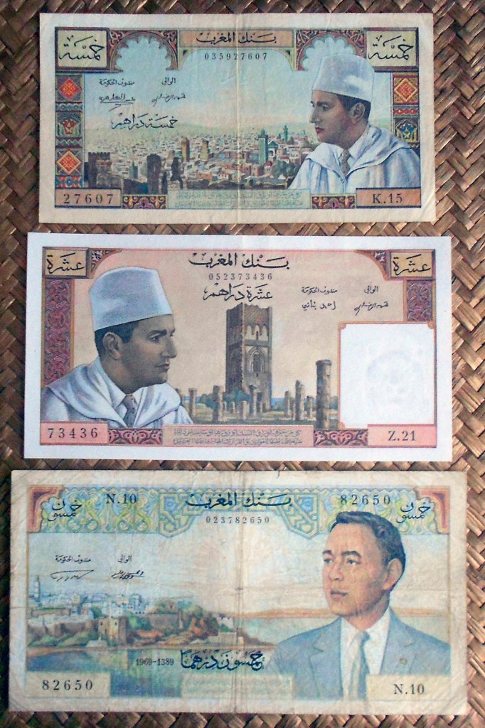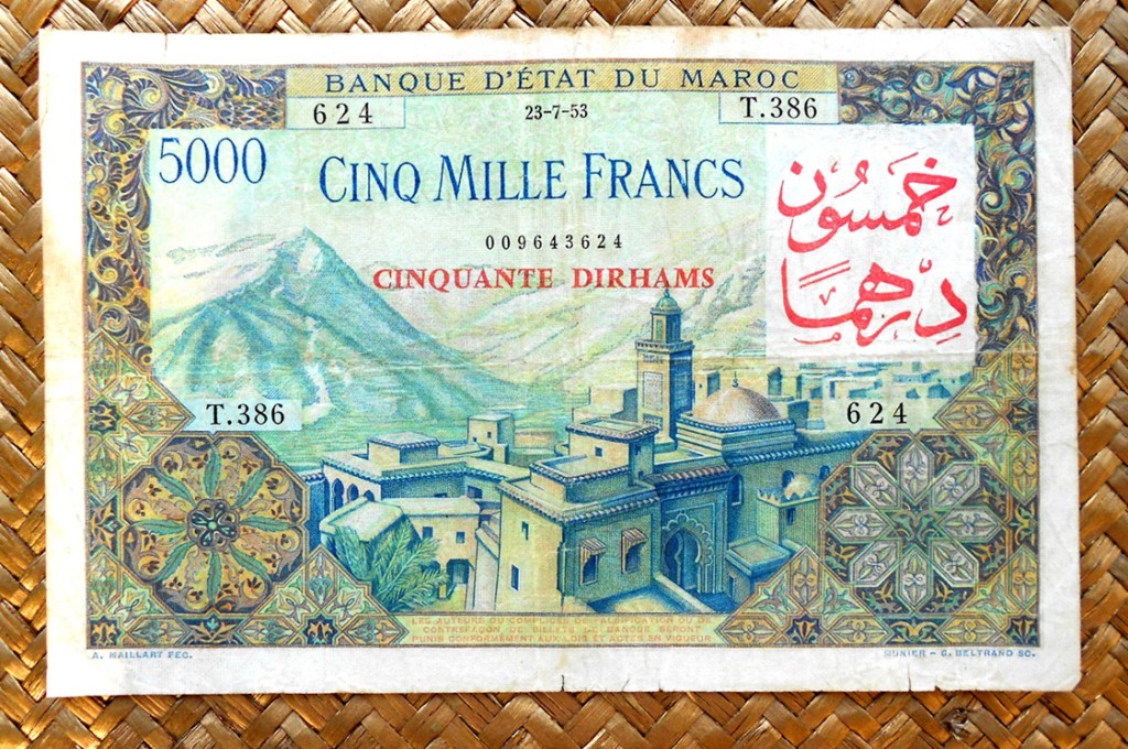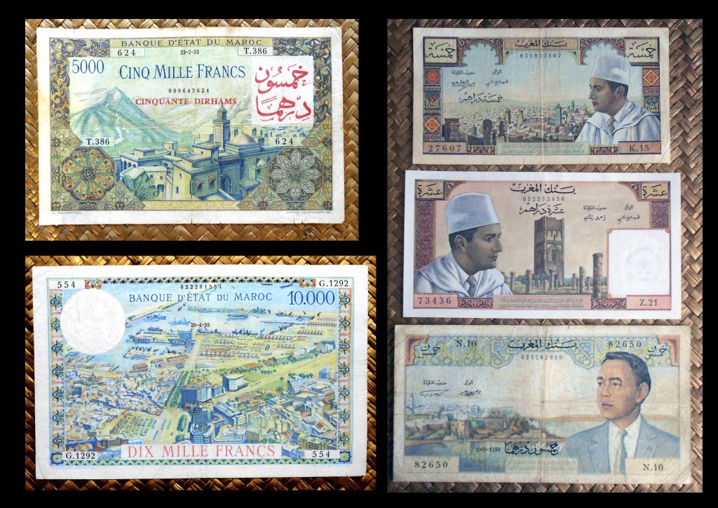 Para borrar todo reminiscencia colonial se redefinió la moneda volviendo a retomar la antigua, el dírham, cuya paridad quedaba establecida en 1 dirham = 100 francos. Los primeros billetes con denominaciones en dírham se editaron sobreimprimiendo los anteriores emitidos en francos por el colonizador. Así la primera denominación de 50 dírhams quedaba reflejada con el resello en cararteres árabes sobre los antiguos 5.000 francos. Lo mismo se hizo con el valor de 100 dírhams sobre los antiguos billetes de 10.000 francos. Posteriormente, ya en los años ‘60 se emitieron nuevos billetes de 5, 10 y 50 dírhams. Los billetes aún circulantes en francos se desmonetizaron en 1974.