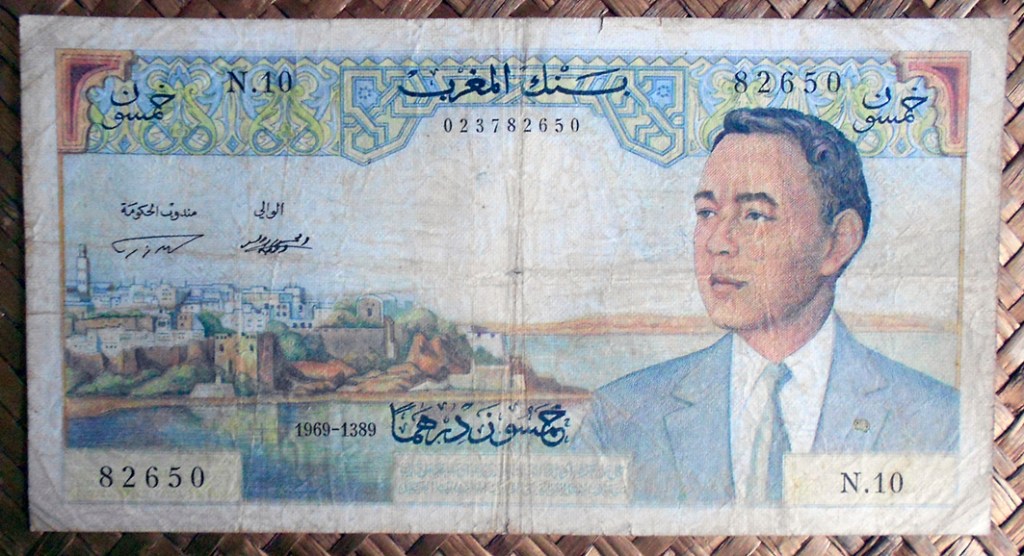 El billete de 50 dirhams de Marruecos de 1969 nos muestra a un joven Hassam II en traje con corbata. Para fondo una vista de la kasbah de los Udayas, el barrio más antiguo (s. XII) de la medina de Rabat. Textos en grafía árabe.