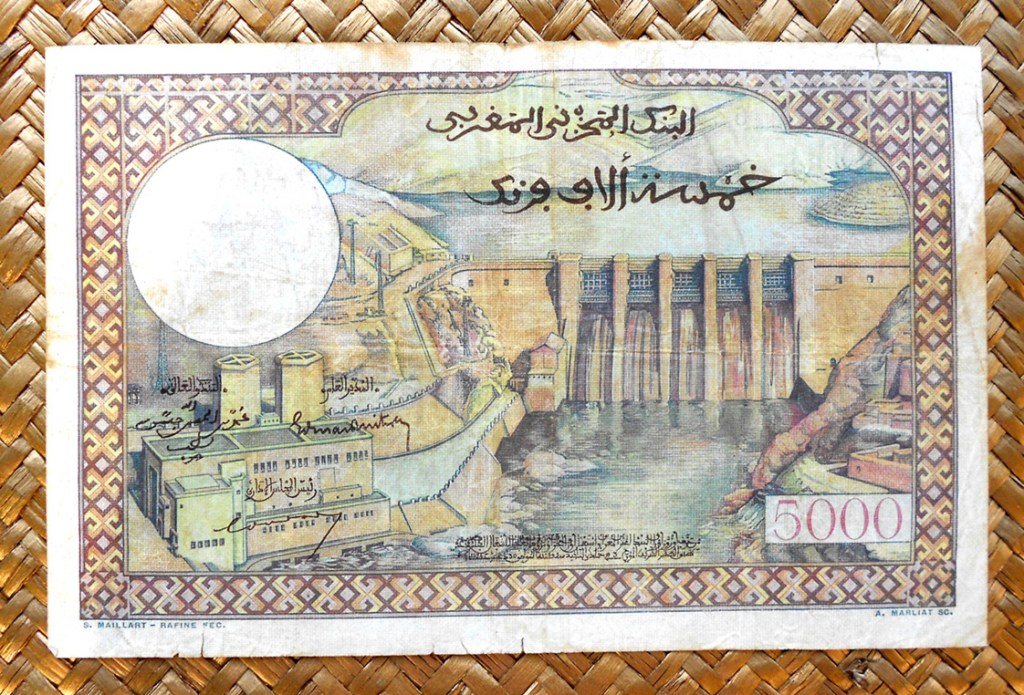 El billete de 10.000 francos resellado 100 dirhams de Marruecos de 1955 (resellado 1959) nos muestra en su anverso una vista de la ciudad de Casablanca. Textos en francés en grafía azul y valor en texto rojo. Obra de los artistas franceses Maillart, Piel, Beltrand, Rafine y Poilliot.