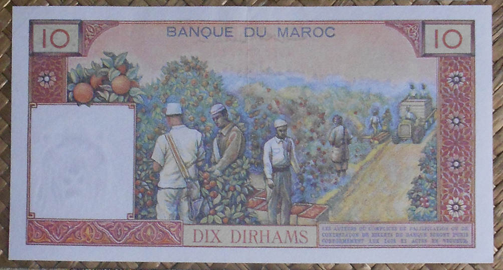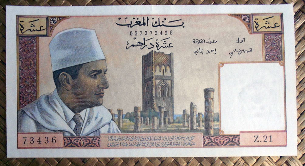 El billete de 10 dirhams de Marruecos de 1963 nos ofrece nuevamente a Mohamed V con el mismo atuendo que en el de 5 dh, pero al lado contrario del campo del anverso. Textos en grafía árabe. El marco esta vez abarca un grabado de la torre Hassam y su columnario alrededor. La torre Hassam es un minarete inacabado de lo que iba a ser la mezquita de Hassam, erigida en 1196 en la ciudad de Rabat, actual capital de Marruecos.