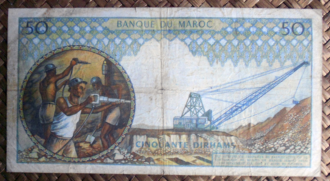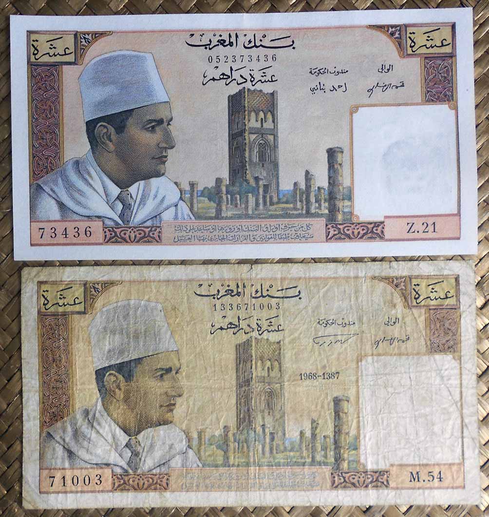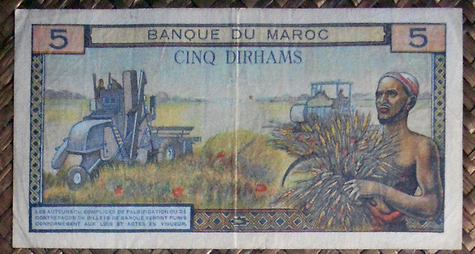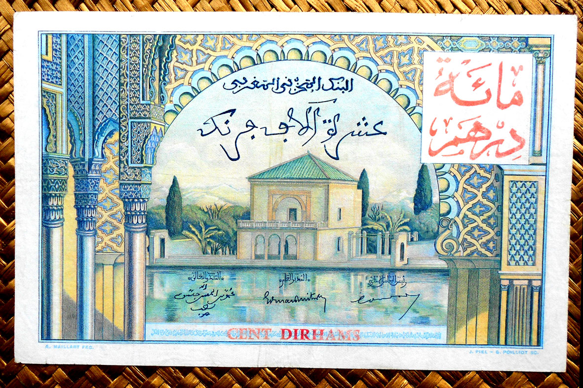 Para borrar todo reminiscencia colonial se redefinió la moneda volviendo a retomar la antigua, el dírham, cuya paridad quedaba establecida en 1 dirham = 100 francos. Los primeros billetes con denominaciones en dírham se editaron sobreimprimiendo los anteriores emitidos en francos por el colonizador. Así la primera denominación de 50 dírhams quedaba reflejada con el resello en cararteres árabes sobre los antiguos 5.000 francos. Lo mismo se hizo con el valor de 100 dírhams sobre los antiguos billetes de 10.000 francos. Posteriormente, ya en los años ‘60 se emitieron nuevos billetes de 5, 10 y 50 dírhams. Los billetes aún circulantes en francos se desmonetizaron en 1974.