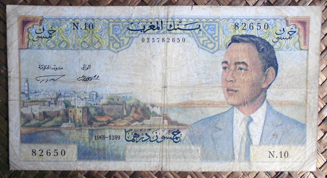 El billete de 50 dirhams de Marruecos de 1969 nos muestra a un joven Hassam II en traje con corbata. Para fondo una vista de la kasbah de los Udayas, el barrio más antiguo (s. XII) de la medina de Rabat. Textos en grafía árabe.