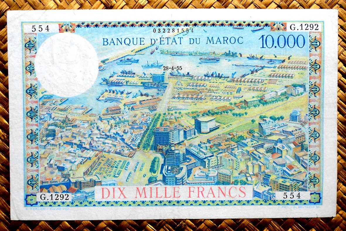 El billete de 10.000 francos resellado 100 dirhams de Marruecos de 1955 (resellado 1959) nos muestra en su anverso una vista de la ciudad de Casablanca. Textos en francés en grafía azul y valor en texto rojo. Obra de los artistas franceses Maillart, Piel, Beltrand, Rafine y Poilliot.