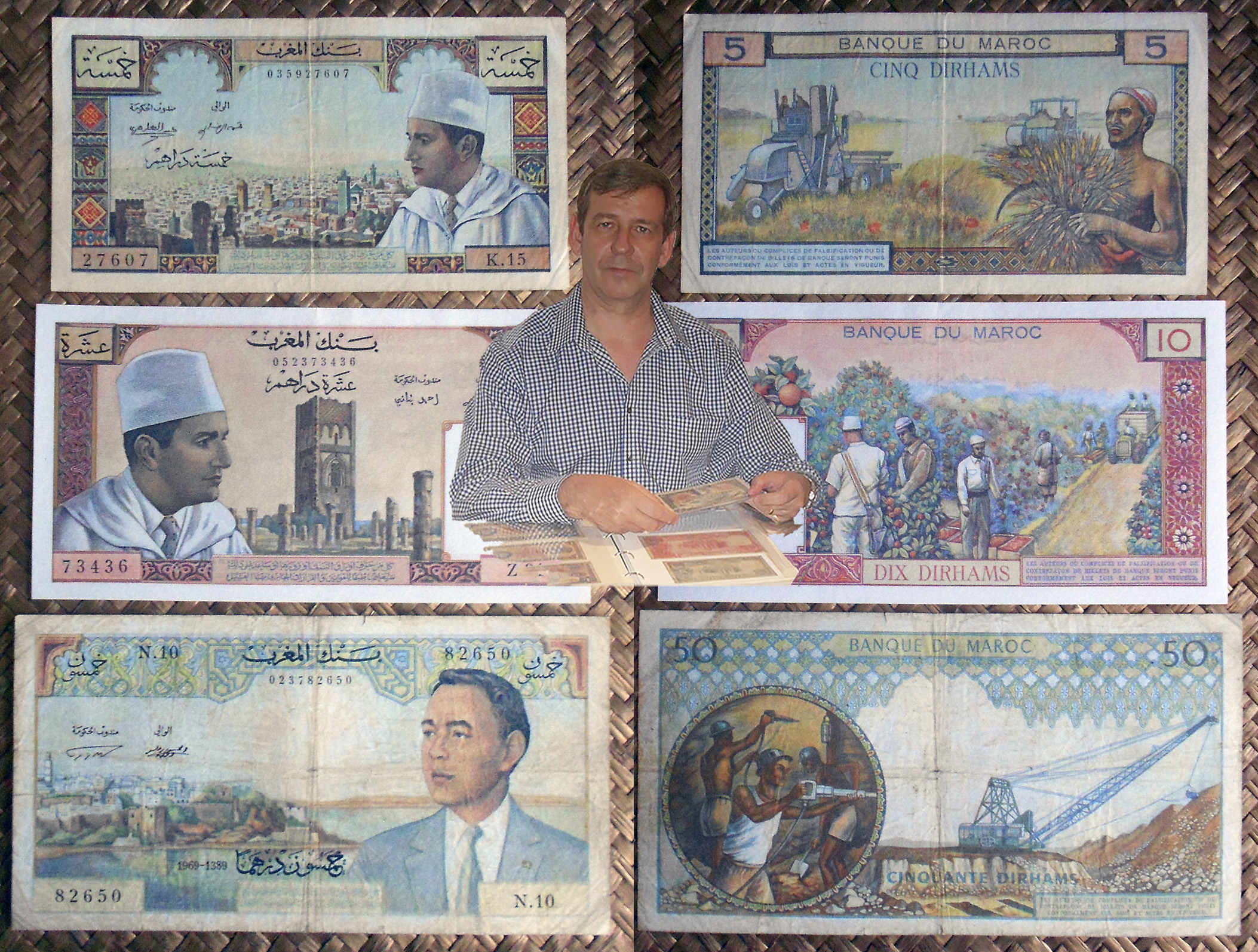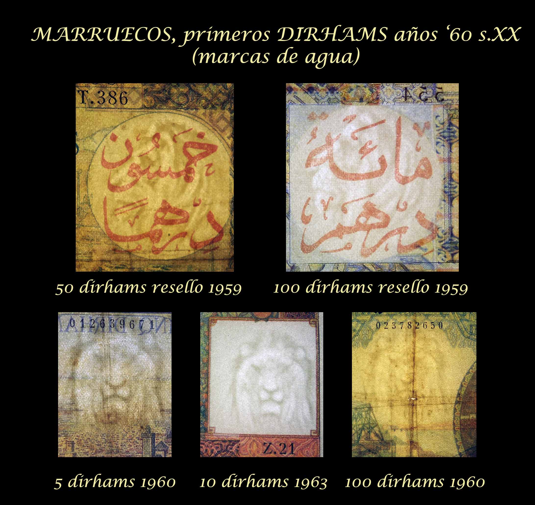 Vamos a revisar los primeros billetes que verían la luz en esta nueva etapa. Contemplaremos los ejemplares de 5.000 francos de 1953 resellado 50 dirhams, 10.000 francos de 1955 resellado 100 dirhams, 5 dirhams de 1960, 10 dirhams de 1963 y 50 dirhams de 1969.