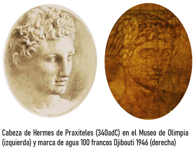 Sus marcas de agua evolucionan del guiño hacia la colonia (cabeza de mujer joven en el ejemplar de Afars e Issas de 1975) a la afirmación patriótica (escudo de armas en los ejemplares de Djibouti de 1991).