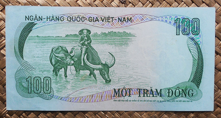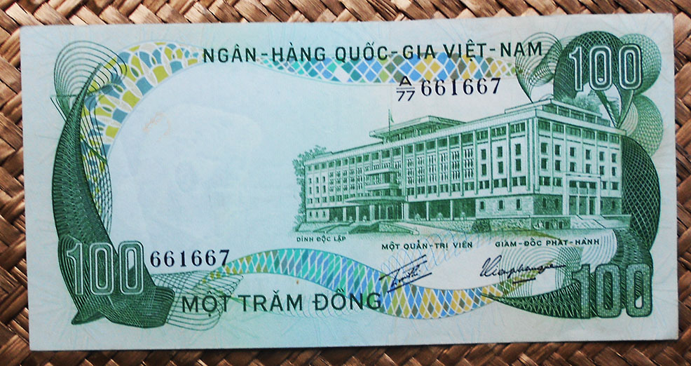El billete de 100 piastras o dong de Vietnam de 1954 lleva las firmas de Gaston Cusin como Le President y de Nghiem Van Tri como Un Administrateur.