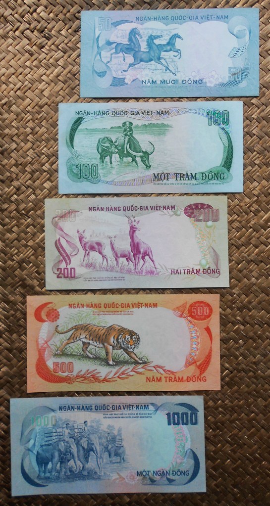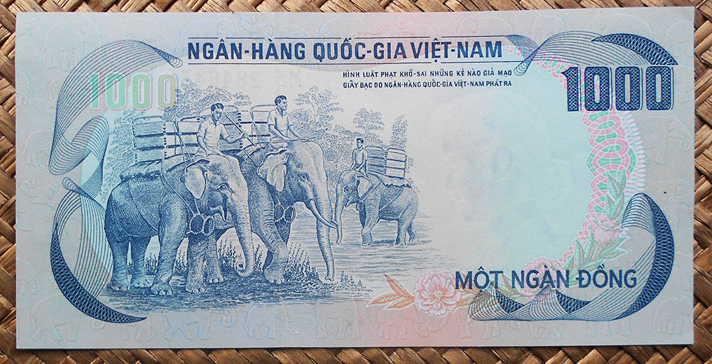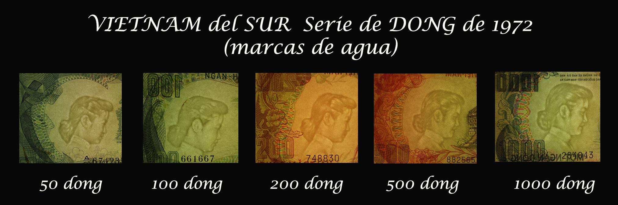 Sus marcas de agua nos ofrecen la cabeza de un elefante en los ejemplares de Camboya y Laos y la cabeza de un tigre en el billete de Vietnam.
