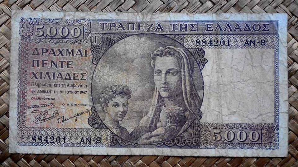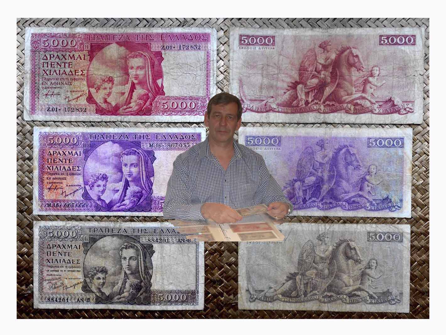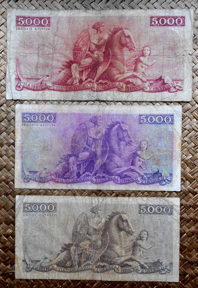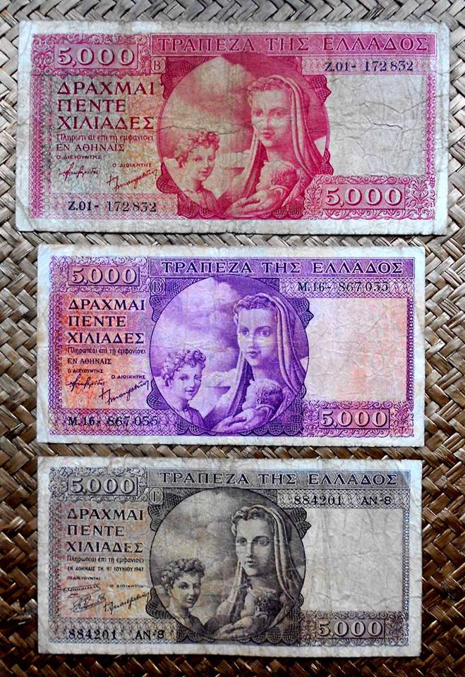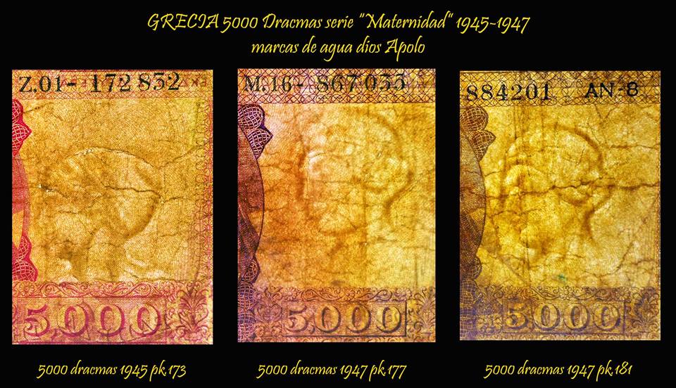 Compararemos los billetes de 5000 dracmas de 1945 (WPM pk. 173), 5000 dracmas de 1947 (pk. 177) y 5000 dracmas de 1947 (pk. 181).