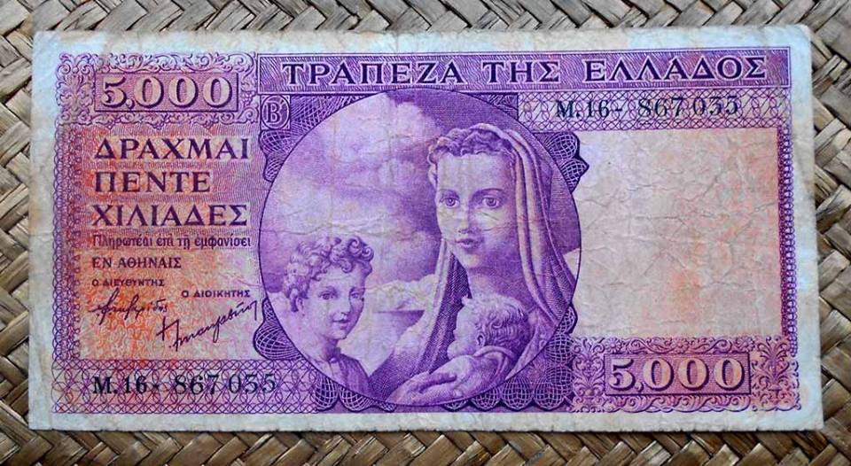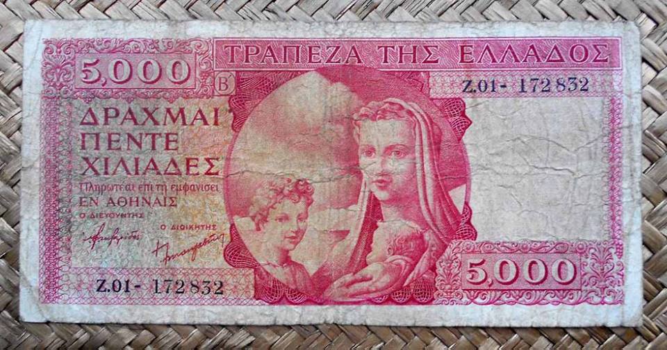 La ocupación alemana derrumbó la economía griega, que sumergió a Grecia en un periodo hiperinflacionario que obligaría al Estado a imprimir billetes de valores millonarios. En el último año de ocupación, 1944, el billetario griego había emitido billetes de hasta 100.000 millones de dracmas. A finales de 1944 se lanzó una reforma monetaria para revaluar la moneda e intentar estabilizar la economía. Se sacaron nuevas emisiones de billetes en “nuevos” dracmas con la paridad de 1 nv.dr. = 50.000 millones de dr. anteriores. Tanto en las emisiones del periodo hiperinflacionario como en las posteriores, ya con el nuevo dracma, se buscaron personajes mitológicos o ilustres pensadores y se recurrió a la Grecia clásica para plasmarla en sus composiciones.