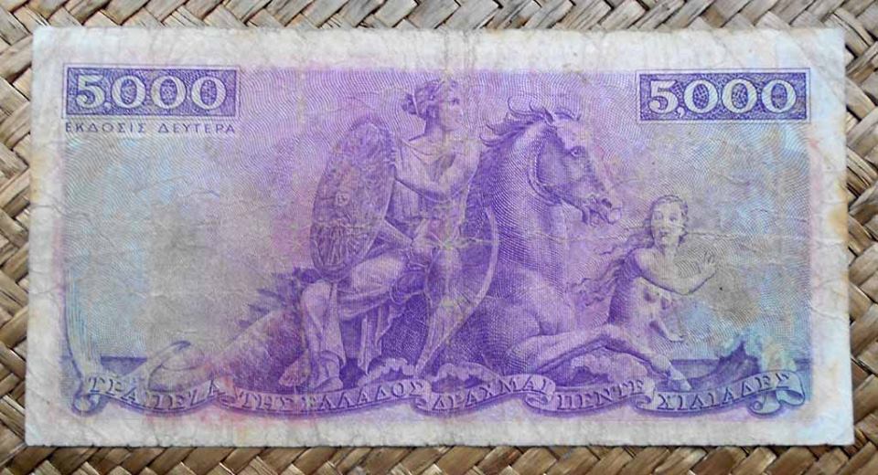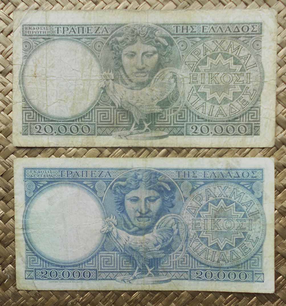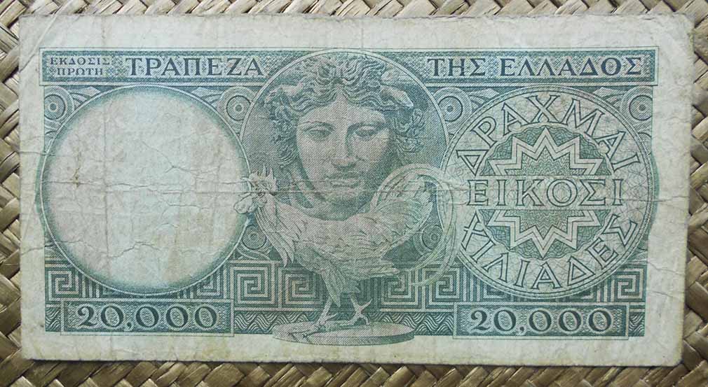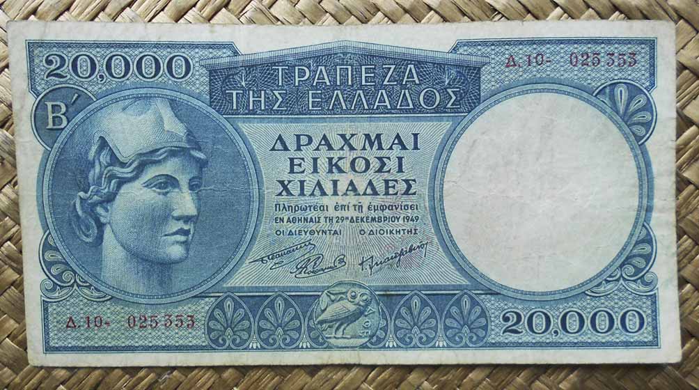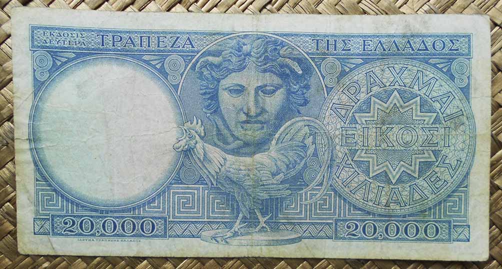 El billete de 20.000 dracmas de Grecia de 1949 nos ofrece a Atenea y a Medusa, anverso y reverso respectivamente, en tonalidades azules. Textos en griego, lleva tres firmas de validación y una B’ sobre la viñeta de Atenea.
