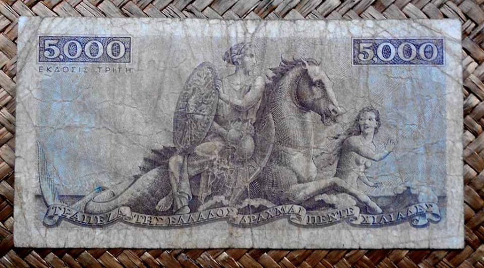 Las identidades de los billetes de 5000 dracmas de Grecia que contemplamos se dan en sus anversos y reversos, su valor y textos.