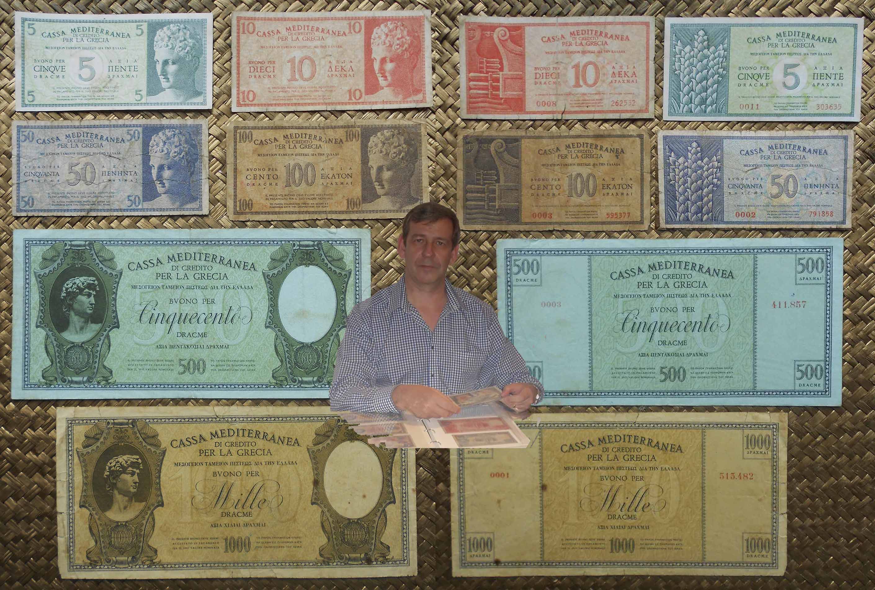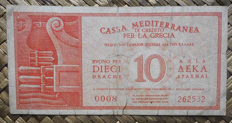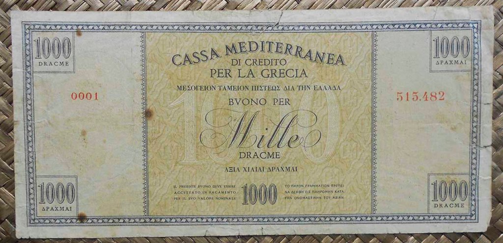 La serie de billetes que vamos a contemplar nos traslada a estas fechas de incertidumbre bancaria. Nada más caer Grecia en manos de los invasores, en abril de 1941 (la zona de la capital, Atenas, en manos italianas y la zona de Tesalónica en manos alemanas) se cancelaron todas las reservas billetarias del Banco Nacional, viendo la luz la serie de dracmas de la “Cassa Mediterranea di Credito per la Grecia” que exponemos.