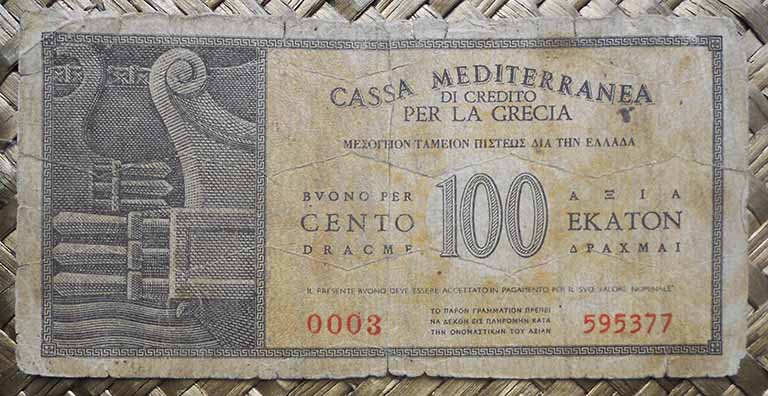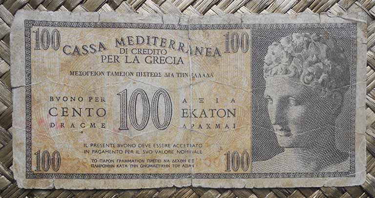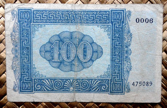 El billete de 100 dracmas de Grecia de 1939 no circuló. Solo sirvieron de billetario fiduciario griego los ejemplares resellados con el valor de 1.000 dracmas, aunque fue efímera su circulación, ya que fueron desmonetizados unas semanas después de ser validados.