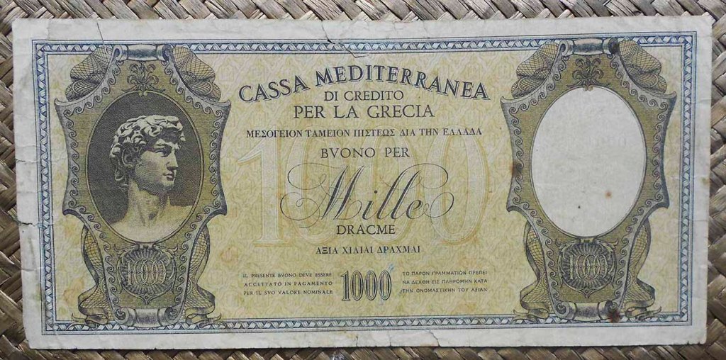El billete de 1000 dracmas de Grecia ocup. Italiana de 1941 presenta cromaticidad predominantemente amarilla con marcos verde oliva. También nos ofrece el busto de David de Miguel Angel en el anverso.